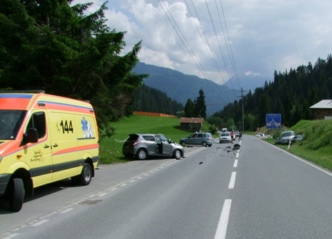 Der Lenker eines Personenwagens fuhr zusammen mit einer Beifahrerin von Flims Richtung Laax. Bei Staderas, auf der abfallenden Geraden vor dem Kreisel, geriet er auf die Gegenfahrbahn und kollidierte seitlich-frontal mit einem entgegenkommenden Personenwagen. Durch die Wucht des Aufpralls wurden beide Fahrzeuge von der Fahrbahn weg auf das Trottoir beziehungsweise das Bord am Strassenrand geschleudert. Alle drei Personen wurden leicht verletzt. Zwei Ambulanzen brachten sie in umliegende Spitäler. Während der Unfallaufnahme und der Bergung der total beschädigten Fahrzeuge und der herumliegenden Fahrzeugteile konnte die Strasse nur einspurig befahren werden. Die Verkehrsbehinderung dauerte rund eineinhalb Stunden.