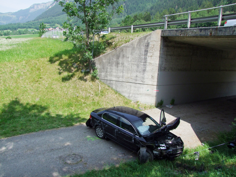 Der Lenker fuhr auf der A13 Richtung Süden. In einer Kurve beim Anschluss Andeer geriet das Fahrzeug rechts von der Strasse ab und fuhr dem Wildschutzzaun entlang. Am Ende dieses Zaunes hob es ab und flog rund elf Meter durch die Luft. Es landete in der Böschung und kam schliesslich in einer Unterführung der A13 zum Stillstand. Der Lenker erlitt leichte Verletzungen und wurde mit der Ambulanz ins Spital gefahren. Sein Sohn wurde schwerer verletzt und musste mit der Rega ins Spital geflogen werden. Das Fahrzeug erlitt Totalschaden.