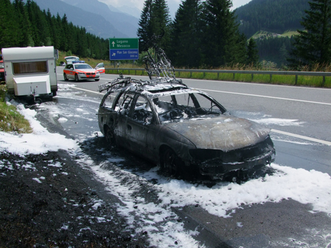 Ein Fahrzeuglenker war mit einem Wohnwagen unterwegs von Italien Richtung San Bernardino. Kurz vor Pian San Giacomo bemerkte er Benzingeruch im Auto. Er fuhr auf den SOS-Ausstellplatz um nachzuschauen. Beim Aussteigen sah er bereits Flammen aus dem hinteren linken Radkasten seines Autos schlagen. Er und seine Mitfahrerin brachten sich sofort in Sicherheit. Die Feuerwehr Mesolcina alta und die Tunnelfeuerwehr San Bernardino löschten das brennende Auto. Während rund eineinhalb Stunden wurde der Verkehr über die Kantonsstrasse umgeleitet. Auch der San Bernardino Tunnel musste gesperrt werden, weil die Tunnelfeuerwehr ausgerückt war. Dies ist eine Vorschrift des Bundes. An beiden Portalen des San Bernardino Tunnels kam es zu Verkehrsbehinderungen.
