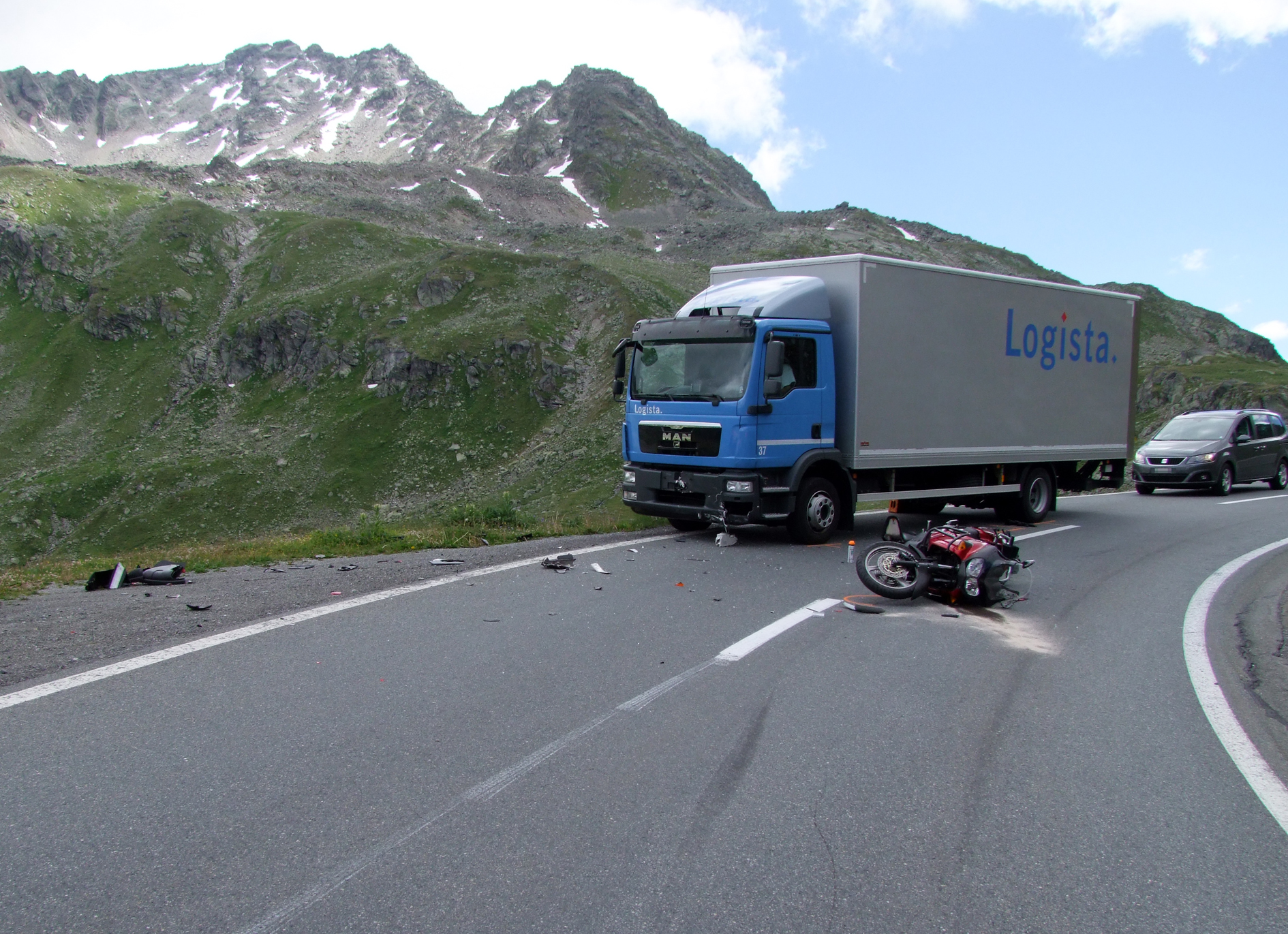 Der Motorradlenker fuhr von Davos Richtung Flüela Hospiz. Rund einen Kilometer vor der Passhöhe geriet er in einer Rechtskurve auf die Gegenfahrbahn und kollidierte seitlich-frontal mit einem entgegenkommenden Lastwagen. Der Motorradfahrer geriet unter das Fahrzeug, wurde aber nicht überrollt. Beim Sturz zog er sich mittelschwere Verletzungen zu. Nach der Erstversorgung durch einen Notarzt wurde der Mann mit der Ambulanz ins Spital Davos gefahren. Am Motorrad entstand Totalschaden, der Lastwagen wurde leicht beschädigt. Die Unfallstelle konnte während rund eineinhalb Stunden nur einspurig befahren werden.