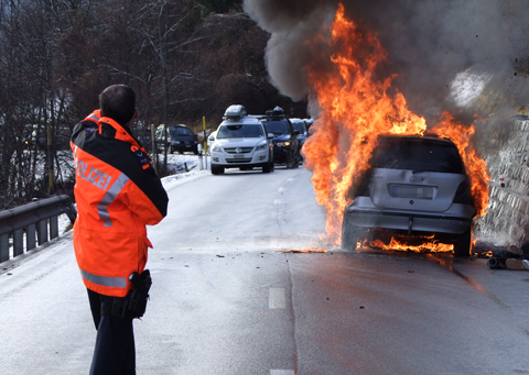 Am Sonntagmittag ist ein Auto auf der Fahrt von Chur nach Lenzerheide vollständig ausgebrannt. Die Kantonsstrasse war zwischen Chur und Malix während rund eineinhalb Stunden gesperrt.
