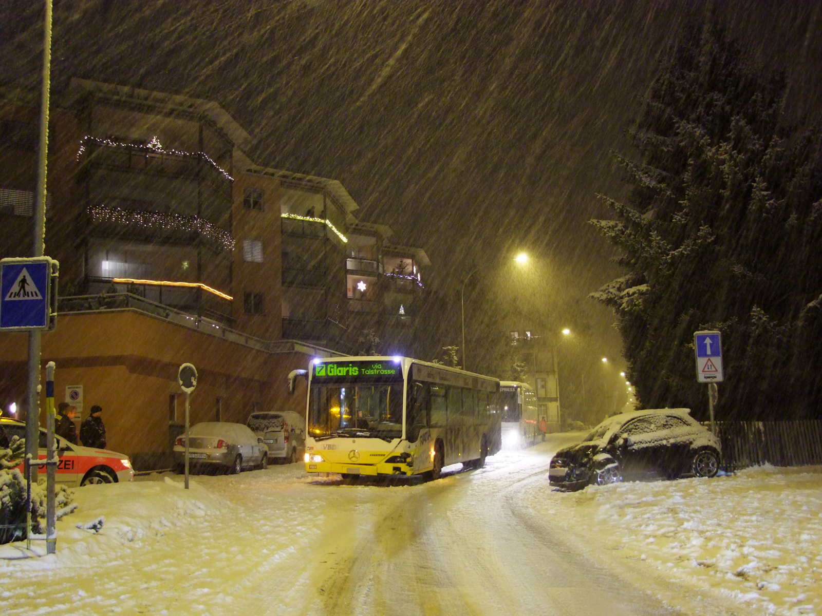 Eine Personenwagenlenkerin und ihre zwei Mitfahrer fuhren um 22.30 Uhr über die Talstrasse von Davos Platz Richtung Davos Dorf. Auf der Höhe des Eisstadions geriet das Auto auf die Gegenfahrbahn und kollidierte frontal mit dem entgegenkommenden Linienbus. Die beiden Männer verletzten sich leicht und wurden zur Kontrolle ins Spital Davos überführt. Bei der Lenkerin wurde eine Blutprobe angeordnet. Der total beschädigte Personenwagen musste abgeschleppt werden. Während der Bergungsarbeiten von rund einer halbe Stunde wurden die Cars, die Besucher des Spengler Cups heimfuhren, über die Promenade umgeleitet.