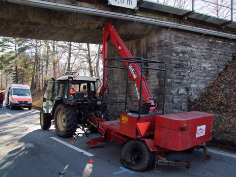 Der Traktorfahrer hatte an seinem Fahrzeug einen Kran angehängt. Der Arm des Krans war jedoch nicht vollständig eingefahren. Als der Lenker kurz vor der Karlihofkreuzung die dortige Unterführung passieren wollte, hängte der Kranarm an der Oberkante der Unterführung an und bremste die Komposition abrupt bis zum Stillstand ab. Der Lenker wurde gegen die Frontscheibe der Kabine geschleudert und erlitt schwere Bauch- und Kopfverletzungen. Am Kranwagen entstand Totalschaden. Beim Traktor ging die Frontscheibe in Brüche. Wegen dieses Unfalls war die Kantonsstrasse zwischen Maienfeld und der Karlihofkreuzung während gut einer Stunde in beiden Richtungen gesperrt.