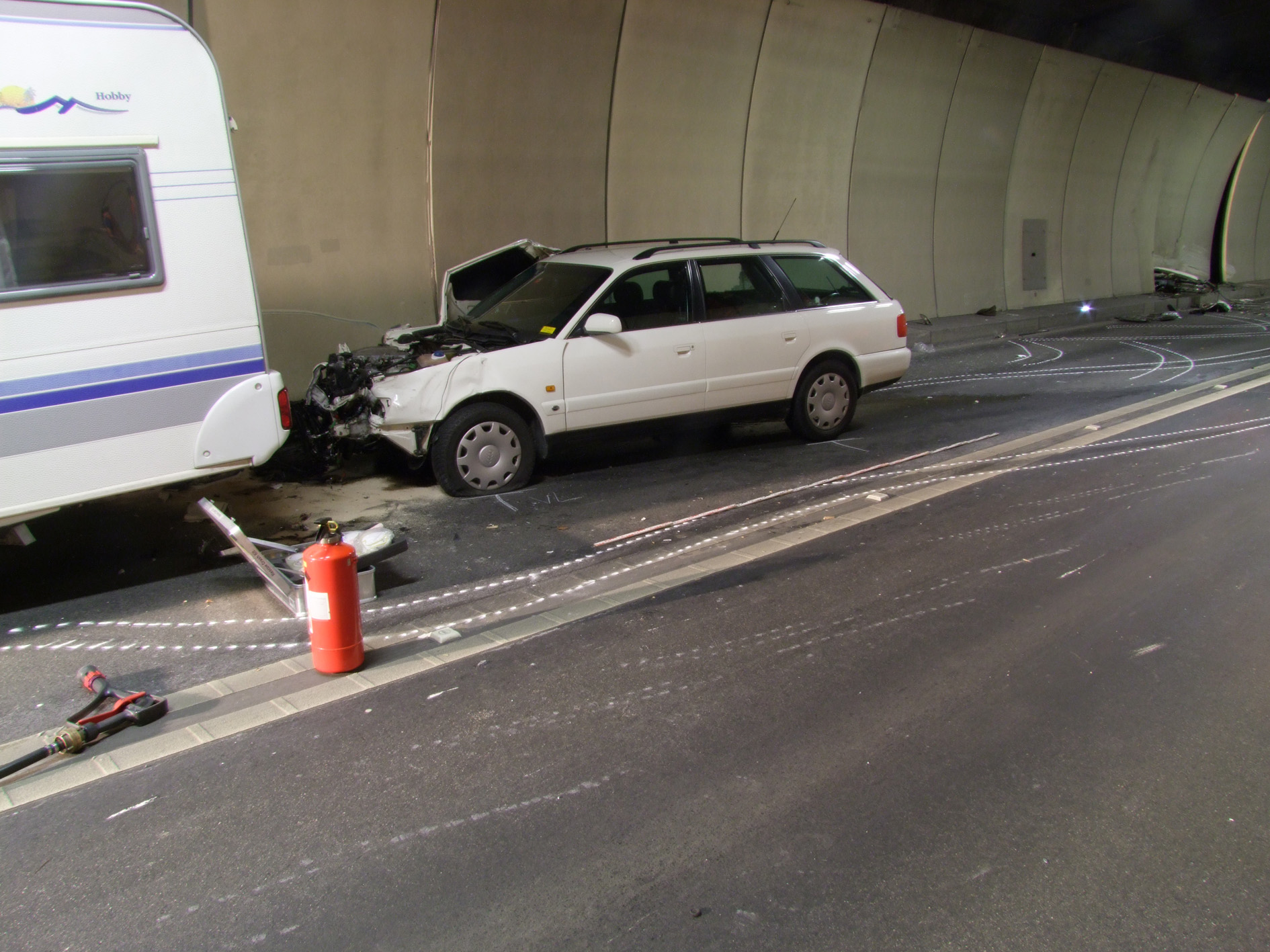 Ein Personenwagenlenker fuhr mit seinem Wohnwagenanhänger von San Bernardino herkommend in Ritchtung Norden. Plötzlich geriet das Gefährt ins Schleudern und prallte gegen die rechte Tunnelwand. In der Folge riss sich der Wohnanhänger vom Zugfahrzeug und kam schleudernd vor dem Auto auf der rechten Fahrspur zum Stillstand. Mit leichten Verletzungen wurde die Mitfahrerin mit der Ambulanz ins Spital nach Bellinzona verbracht. Die stark beschädigten Fahrzeuge mussten abgeschleppt werden. Aus Sicherheitsgründen haben Mitarbeiter des Tiefbauamtes Graubünden mit einem Spezialfahrzeug zwei durch den Unfall beschädigten Seitenwandplatten ausgewechselt. Dies führte zur rund zweieinhalbstündigen Sperrung des Tunnels in beiden Richtungen. Da der San Bernardinopass noch Wintersperre hat, konnte der Verkehr nicht umgeleitet werden. In der Folge kam es zu beträchtlichem Rückstau in beiden Richtungen.
