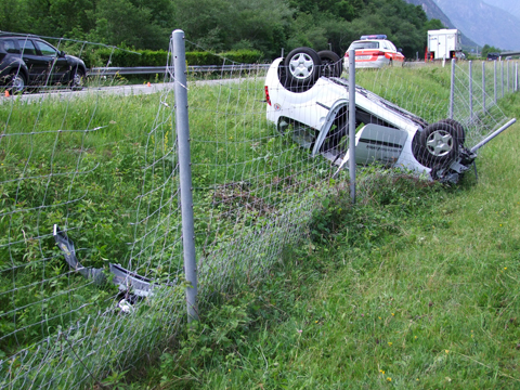 Die Fahrzeuglenkerin fuhr um 7.15 Uhr auf der Autostrasse A13 von Mesocco Richtung Bellinzona. Kurz vor der Ausfahrt Lostallo kollidierte das Auto mit der Mittelleitplanke, überschlug sich mehrmals und kam von der Fahrbahn ab. Auf der rechtsseitigen Wiese kam es auf dem Dach liegend zum Stillstand. Die Ambulanz überführte die leicht Verletzte ins Spital San Giovanni nach Bellinzona. Am Auto entstand Totalschaden.
