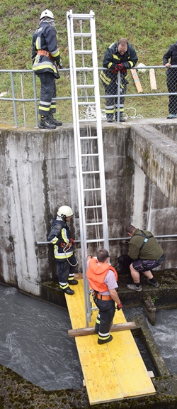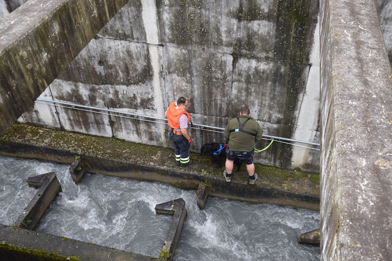 Eine Frau spazierte mit ihren beiden Hunden über das Stauwehr. Plötzlich sah sie eines der beiden Tiere nicht mehr. Als sie nach ihm suchte, entdeckte sie es rund 20 Meter unterhalb der Staumauer im Wasser der Fischtreppe. Dem Tier gelang es, aus eigener Kraft aus dem Wasser zu klettern und sich auf einem Mauervorsprung in Sicherheit zu bringen. Weiter kam der Hund dann aber nicht mehr alleine. Bis zum Eintreffen von Polizei und Feuerwehr betreute eine Passantin den Hund. Die Feuerwehr Domat/Ems-Felsberg konnte ihn schliesslich nach rund eineinhalb Stunden mit einer Leiter und einem Seil aus seiner misslichen Lage befreien. Eine Tierärztin untersuchte den Hund und stellte fest, dass er wohlauf war. Warum der Hund in die Fischtreppe gestürzt ist, kann nicht gesagt werden.