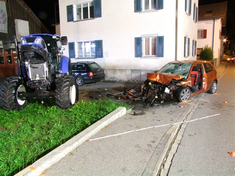 Der 25-jährige Autolenker fuhr kurz vor 23 Uhr auf der Domleschgerstrasse Richtung Thusis. In Sils im Domleschg geriet er in einer Rechtskurve über den linken Fahrbahnrand hinaus. Er fuhr über das Trottoir und prallte frontal in einen Traktor einer Landmaschinengarage. Der fabrikneue Traktor war auf einer Wiese vor dem Garagenareal ausgestellt. Der Lenker wurde im Fahrzeug eingeklemmt und durch die Strassenrettung der Feuerwehr Thusis geborgen. Die Sanität des Spitals Thusis versorgte den Schwerverletzten notfallmedizinisch. Mit der Rega wurde der Mann anschliessend ins Kantonsspital Graubünden nach Chur geflogen. Die Kantonspolizei Graubünden ordnete bei ihm eine Blutprobe an. Am Auto und am Traktor entstand Totalschaden. Aus dem beschädigten Traktor floss eine geringe Menge Öl ins Erdreich. Das Erdreich muss abgetragen werden.