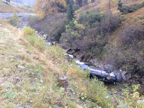 Der 46-jährige Personenwagenlenker fuhr mit seinem Fahrzeug von Splügen kommend in Richtung Splügenpass. Oberhalb Splügen geriet er vor einer Linkskurve mit seinem Fahrzeug rechts von der Strasse ab. Folglich stürzte er etwa 10 Meter eine Böschung hinunter. Das Fahrzeug kam im dortigen Bach auf dem Dach liegend zum Stillstand. Der Mann konnte sich selbständig befreien. Er musste mit Rückenverletzungen mit der Rega in das Kantonsspital Graubünden nach Chur geflogen werden. Für die Bergung des total beschädigten Personenwagens musste die Passstrasse für rund 45 Minuten gesperrt werden.