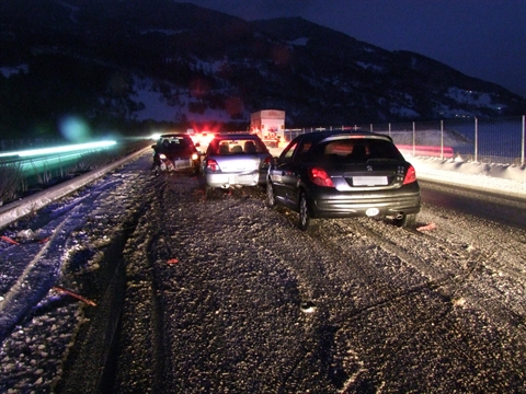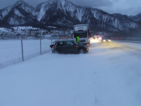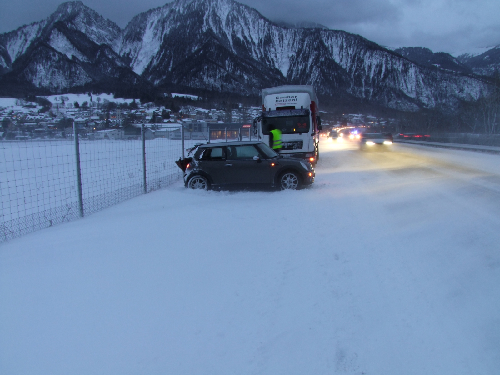 Eine 25-jährige Automobilistin fuhr kurz vor 7 Uhr auf der Nordspur der Autobahn A13 von Chur in Richtung Landquart. Im Bereiche des Zizerser Feldes war die Fahrbahn infolge starker Winde schneebedeckt. Ihr Fahrzeug geriet ins Schleudern, kollidierte mit der Mittelleitplanke und kam auf der Überholspur zum Stillstand. Zwischen zwei nachfolgenden Fahrzeugen kam es zu einer Auffahrkollision. Ein vierter Fahrzeuglenker wollte den stillstehenden Fahrzeugen ausweichen, wobei er mit einem auf der Normalspur fahrenden Lastwagen kollidierte. Zwei erheblich beschädigte Personenwagen wurden abgeschleppt. Die Patrouille der Kantonspolizei Graubünden leitete während eineinhalb Stunden den Verkehr einspurig an der Unfallstelle vorbei. Dabei kam es zu einem Rückstau.