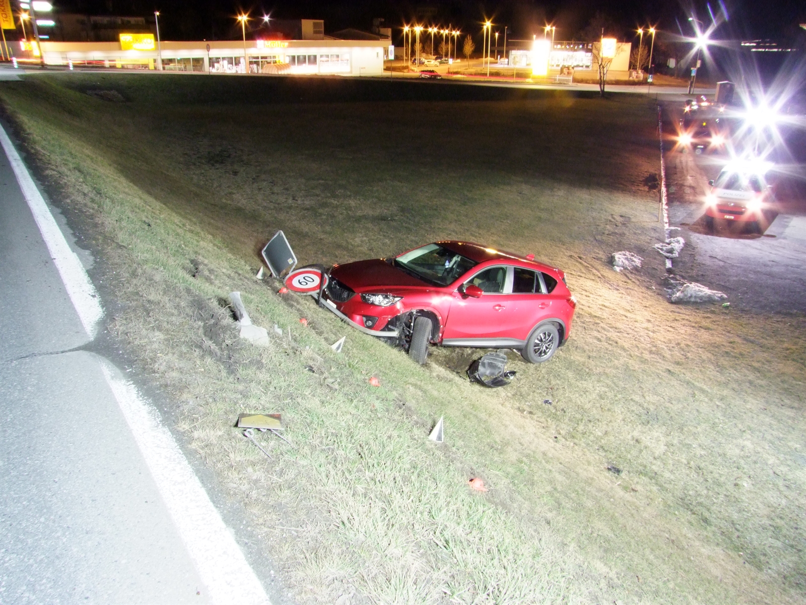 Auf der Fahrt in Richtung Papierfabrik geriet ein Automobilist mit seinem Wagen über den rechten Fahrbahnrand hinaus und kollidierte dabei mit der Ortstafel „Landquart“ und der am gleichen Eisenrohr angebrachten Geschwindigkeitstafel „60“. Anschliessend rutschte das Fahrzeug rückwärts das Wiesenbord hinunter. Auf dem darunterliegenden Parkplatz kam es auf den Rädern zum Stillstand. Es entstand beträchtlicher Sachschaden.