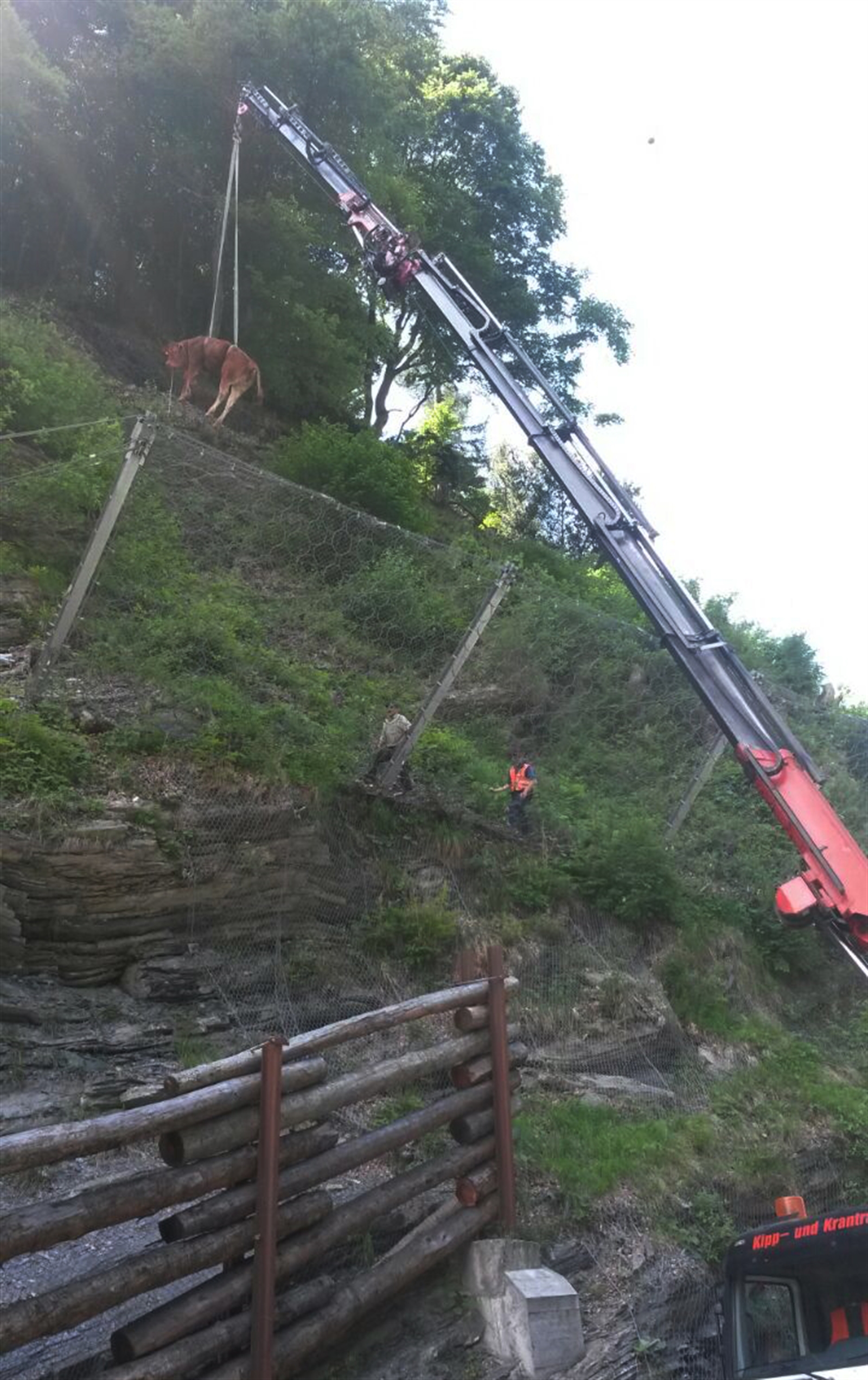 Das Tier riss beim Verladen auf einem Bauernhof aus und flüchtete in den Wald oberhalb der Nationalstrasse A28. Im steilen Gelände stürzte es rund 30 Meter einen Abhang hinunter und wurde von den Stahlnetzen aufgefangen, die eigentlich Steine und Geröll von der Strasse fernhalten sollten. Das Tier konnte mit einem Lastwagenkran geborgen werden. Während der Bergungsarbeiten musste der Verkehr auf der Nationalstrasse kurzzeitig angehalten werden.