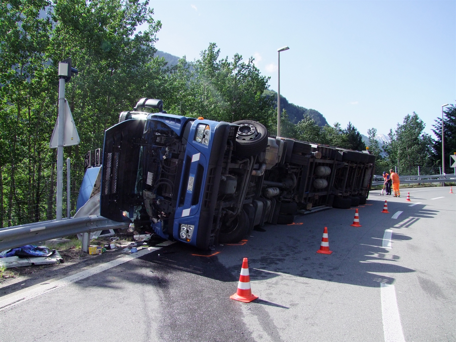 Ein 52-jähriger italienischer Fahrzeuglenker fuhr mit dem Sattelmotorfahrzeug auf der A 13 in Richtung Süden. In der sogenannten Valascia-Kurve bei Mesocco verschob sich die ungesicherte Ladung auf dem Auflieger. Durch die Gewichtsverlagerung kippte das Fahrzeug um. Der Lenker blieb unverletzt. Die Bergung des Fahrzeuges, sowie das Umladen der Ladung von Hand, gestaltete sich äussert schwierig und dauerte bis zum späten Nachmittag. Der Fahrzeugverkehr konnte die Unfallstelle einspurig passieren. Der Sachschaden am Strassenkörper, Leitplanke und Wildschutzzaun ist sehr gross. Am Sattelmotorfahrzeug entstand Totalschaden. Neben der Kantonspolizei Graubünden standen das Tiefbauamt Graubünden und ein Abschleppunternehmen im Einsatz.