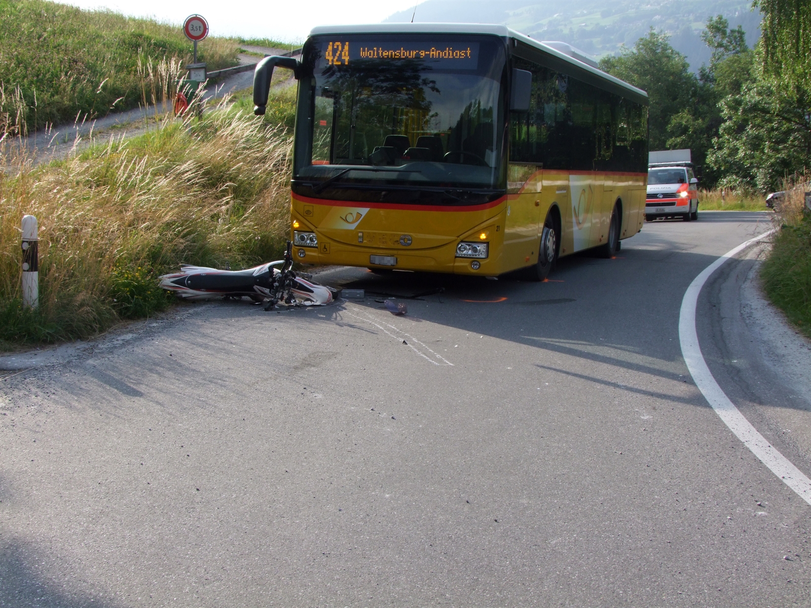 Der Zweiradfahrer war von Andiast in Richtung Waltensburg unterwegs. Eingangs einer Rechtskurve sah er, wie ihm ein Postauto entgegenkam. Deshalb bremste er sein Motorrad ab und geriet ins Schleudern. Daraufhin kam er auf die Gegenfahrbahn, wo das Motorrad frontal mit dem Postauto kollidierte. Am Zweirad entstand Totalschaden. Das Postauto wurde geringfügig beschädigt.