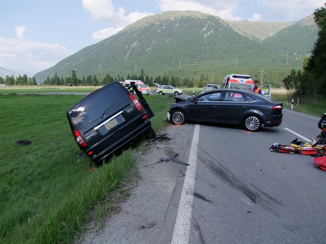 Ein 28-jähriger Personenwagenlenker fuhr von St. Moritz kommend in Richtung Kreisel Punt Muragl. Bei der Überführung Stazerwald kam es mit einem entgegenkommen Personenwagen zu einer heftigen Streifkollision. Dieser Personenwagen geriet über die abfallende Böschung und überschlug sich mehrmals auf dem angrenzenden Wiesland. Der 52-jährige Lenker und seine Beifahrerin wurden nicht verletzt. Anschliessend kollidierte das Fahrzeug frontal mit einem nachfolgenden Personenwagen. Dessen 76-jähriger Lenker wurde leicht und seine beiden Mitfahrerinnen mittelschwer und schwer verletzt. Der Lenker des ersten Fahrzeugs sowie seine Fahrzeuginsassin wurden leicht verletzt.