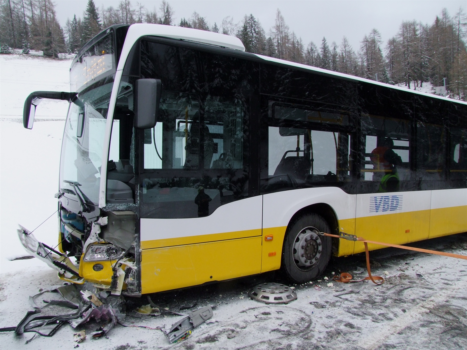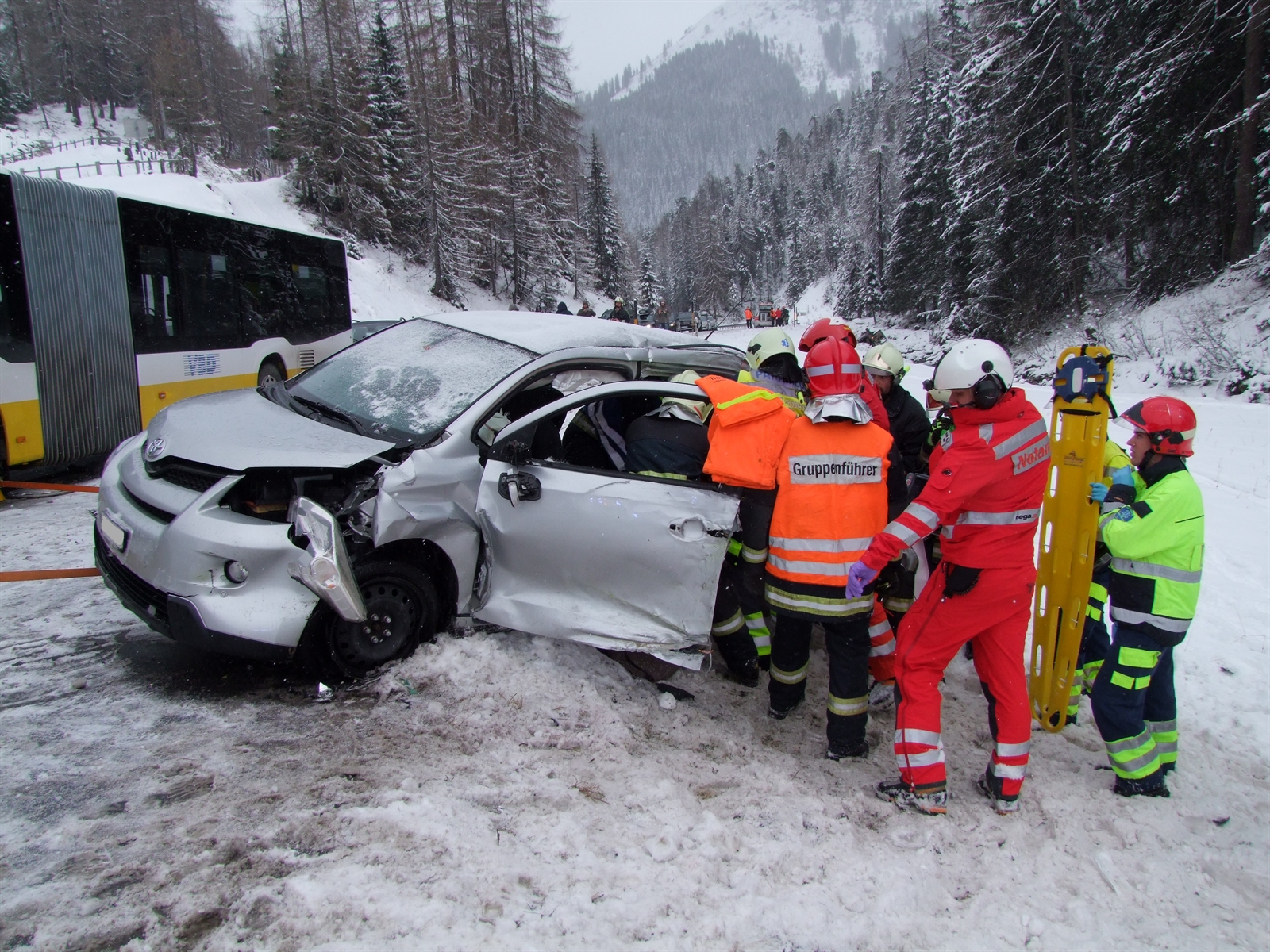 Ein Personenwagenlenker fuhr auf der Hauptstrasse 28 von Davos kommend talwärts in Richtung Klosters. In einer Rechtskurve oberhalb Laret geriet sein Fahrzeug auf der schneebedeckten Fahrbahn auf die Gegenfahrbahn. Dabei kollidierte es seitlich-frontal mit einem entgegenkommenden Linienbus. Eine hinten links im Personenwagen mitfahrende 15-jährige Jugendliche wurde im Fahrzeug eingeklemmt. Dabei erlitt sie schwere Verletzungen. Die Strassenrettung der Feuerwehr Davos konnte sie aus dem Fahrzeug bergen. Sie wurde anschliessend mit der Rega ins Kantonsspital Graubünden geflogen. Zwei weitere Mitfahrerinnen des Personenwagens wurden leicht verletzt und mit der Ambulanz ins Spital Davos verbracht. Der Fahrzeuglenker des Personenwagens begab sich in ambulante Behandlung. Ein weiterer Mitfahrer blieb unverletzt. Der Chauffeur des Linienbusses sowie seine fünf Fahrgäste blieben ebenfalls unverletzt. Der Verkehr war während rund eineinhalb Stunden blockiert, wurde danach einspurig an der Unfallstelle vorbeigeführt und konnte nach insgesamt zwei Stunden wieder ungehindert passieren. Der total beschädigte Personenwagen wurde abtransportiert.