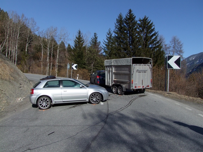 Ein Junglenker fuhr auf der Julierstrasse von Vazerol in Richtung Tiefencastel. Bei der Örtlichkeit Bot Radond geriet sein Fahrzeug in der dortigen unübersichtlichen Rechtskurve auf die Gegenfahrbahn, wo es heftig mit dem Tiertransportanhänger einer entgegenkommenden Fahrzeugkombination kollidierte. Das Auto wurde total und der Anhänger erheblich beschädigt. Der Junglenker und sein Mitfahrer zogen sich leichte Verletzungen zu und begaben sich selbständig zum Arzt. Eine im Tiertransportanhänger mitgeführte Kuh wurde verletzt und musste durch einen Tierarzt versorgt werden. Der Verkehr wurde während rund zwei Stunden wechselseitig an der Unfallstelle vorbeigeführt.