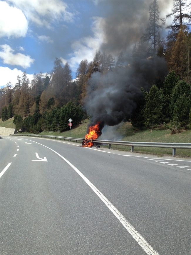 Kurz darauf stand der Töff in Vollbrand. Die Feuerwehr Trais Lejs, Stützpunkt Silvaplana,