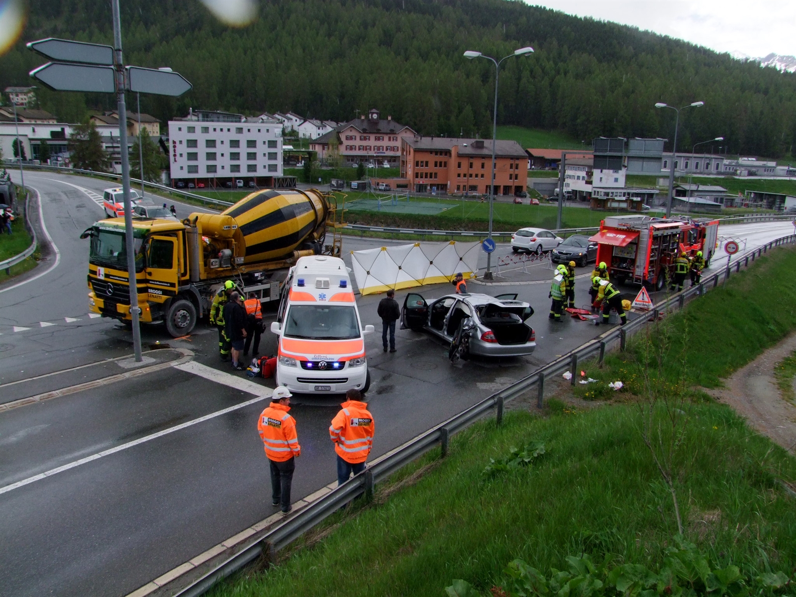Ein Personenwagen mit deutschen Kontrollschildern fuhr kurz nach 14.30 Uhr von Pontresina in Richtung Samedan. Als das Fahrzeug bei der Örtlichkeit Gitögla in die Hauptstrasse einbog, kam es zu einer heftigen seitlich-frontalen Kollision mit einem in Richtung Berninapass fahrenden Vierachs-Betonmischer. Der Chauffeur des Betonmischers sowie drei Insassen des Personenwagens verletzten sich leicht. Sie wurden mit der Ambulanz ins Spital nach Samedan überführt. Eine Frau, die sich auf dem Rücksitz des Personenwagens befand, wurde mittelschwer verletzt. Die Rega flog sie ins Kantonsspital Graubünden nach Chur. Die Feuerwehr Samedan-Pontresina musste den Personenwagen aufbrechen, um die Verletzten zu bergen. Während der Rettungsarbeiten und der Tatbestandsaufnahme leitete die Kantonspolizei Graubünden den Verkehr einspurig an der Unfallstelle vorbei.