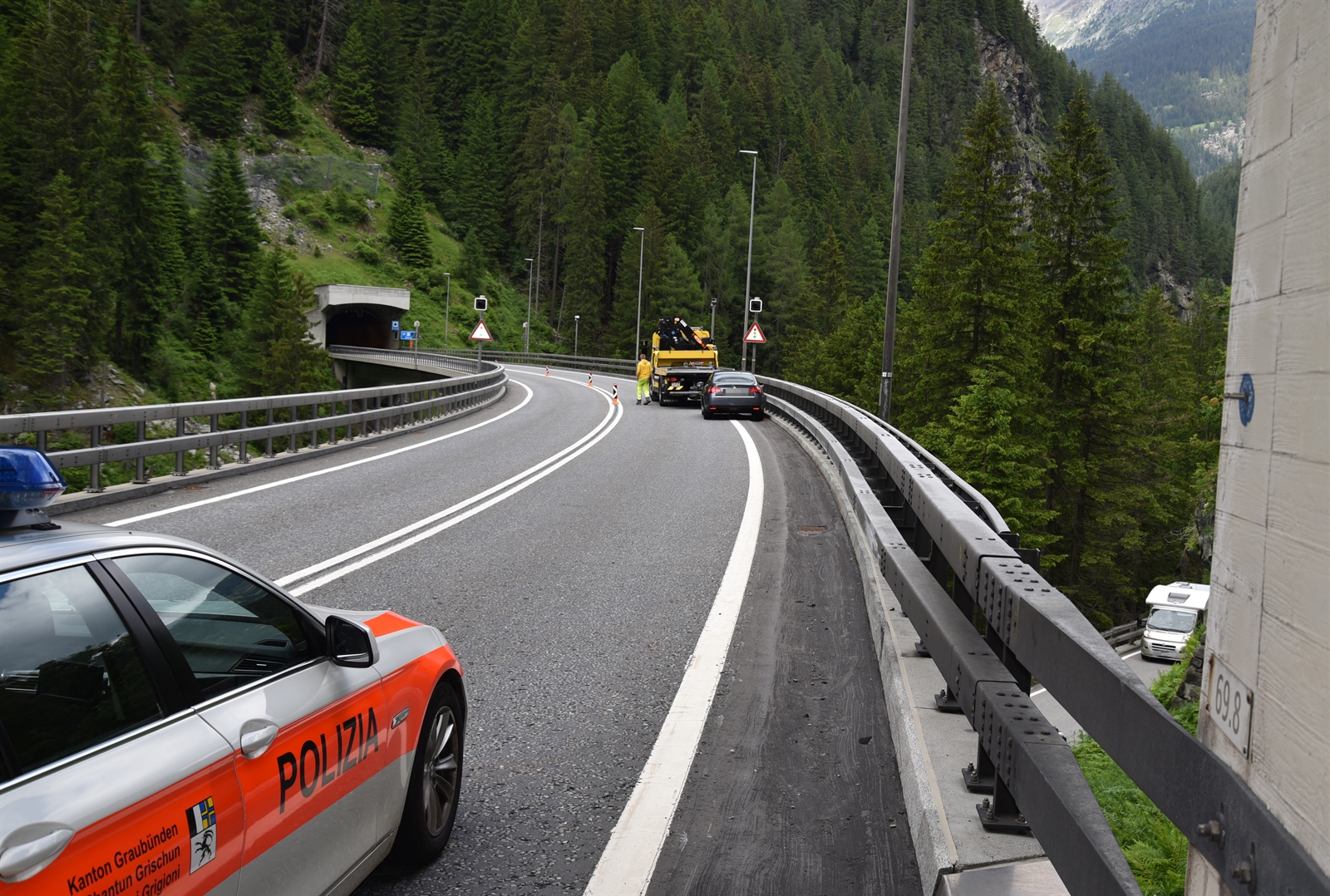 Aufgrund eines medizinischen Problems bremste der 71-jährige Lenker den Personenwagen auf der Nordspur des Tunnels Traversa ab. Auf der Brücke nach dem Tunnel kollidierte das Fahrzeug schliesslich mit der rechtsseitigen Leitplanke und kam nach rund dreissig Metern zum Stillstand. Die Rega überführte den Mann ins Kantonsspital Graubünden nach Chur. Seine 84-jährige Ehefrau wurde leicht verletzt und mit der Ambulanz ins Spital nach Thusis gebracht. Während der Rettungs- und Bergungsarbeiten war die A13 in beide Richtungen gesperrt. Die Kantonspolizei Graubünden leitete den Verkehr über die Kantonsstrasse um.