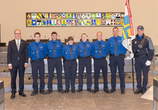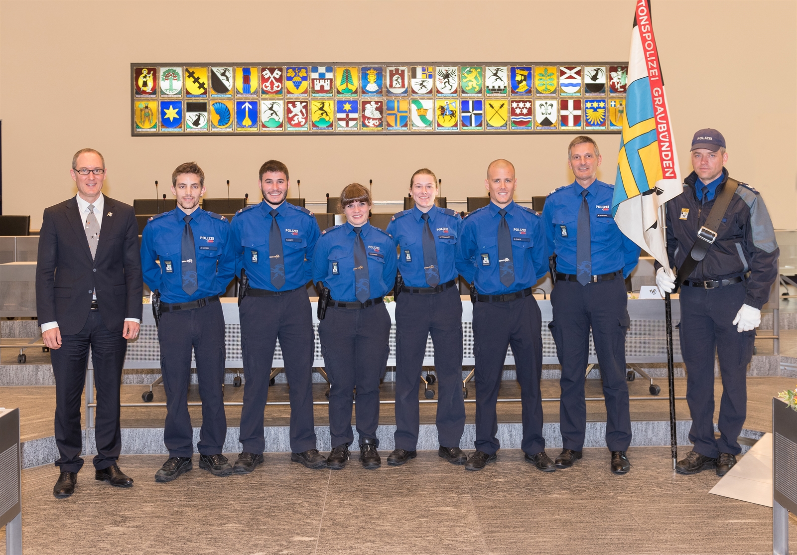 La polizia chantunala dal Grischun ha duas novas polizistas e trais novs polizists. A la festa da brevetaziun, venderdi avantmezdi en la sala dal cussegl grond a Cuira, han ellas ed els prestà l'empermischun. Suenter ina scolaziun intensiva cumenzan ellas ed els immediat lur servetsch en il corp da polizia dal chantun.