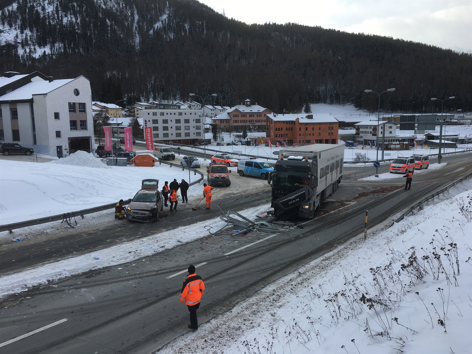 In Pontresina hat sich am Montagnachmittag eine Kollision zwischen einem Personenwagen und einem Sattelmotorfahrzeug ereignet. Eine Person wurde dabei verletzt.