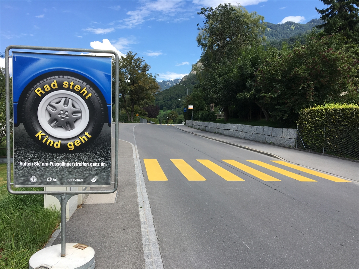 Die gemeinsame Verkehrssicherheitskampagne "Rad steht – Kind geht" der Beratungsstelle für Unfallverhütung (bfu) und des Touring Clubs Schweiz (TCS) wird von der Kantonspolizei Graubünden unterstützt. Sie bittet die Fahrzeuglenkenden, an Fussgängerstreifen immer vollständig anzuhalten. Denn die Kinder lernen im Verkehrsunterricht erst dann die Strasse zu betreten, wenn die Räder vollständig stillstehen. Notwendig ist dies, weil Kinder die Geschwindigkeit von Fahrzeugen und die Distanz noch nicht abschätzen können.