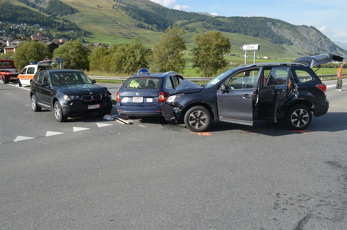 In Zuoz hat sich am Mittwoch eine Kollision mit drei Personenwagen ereignet. Zwei Autolenker und eine Mitfahrerin wurden verletzt.
