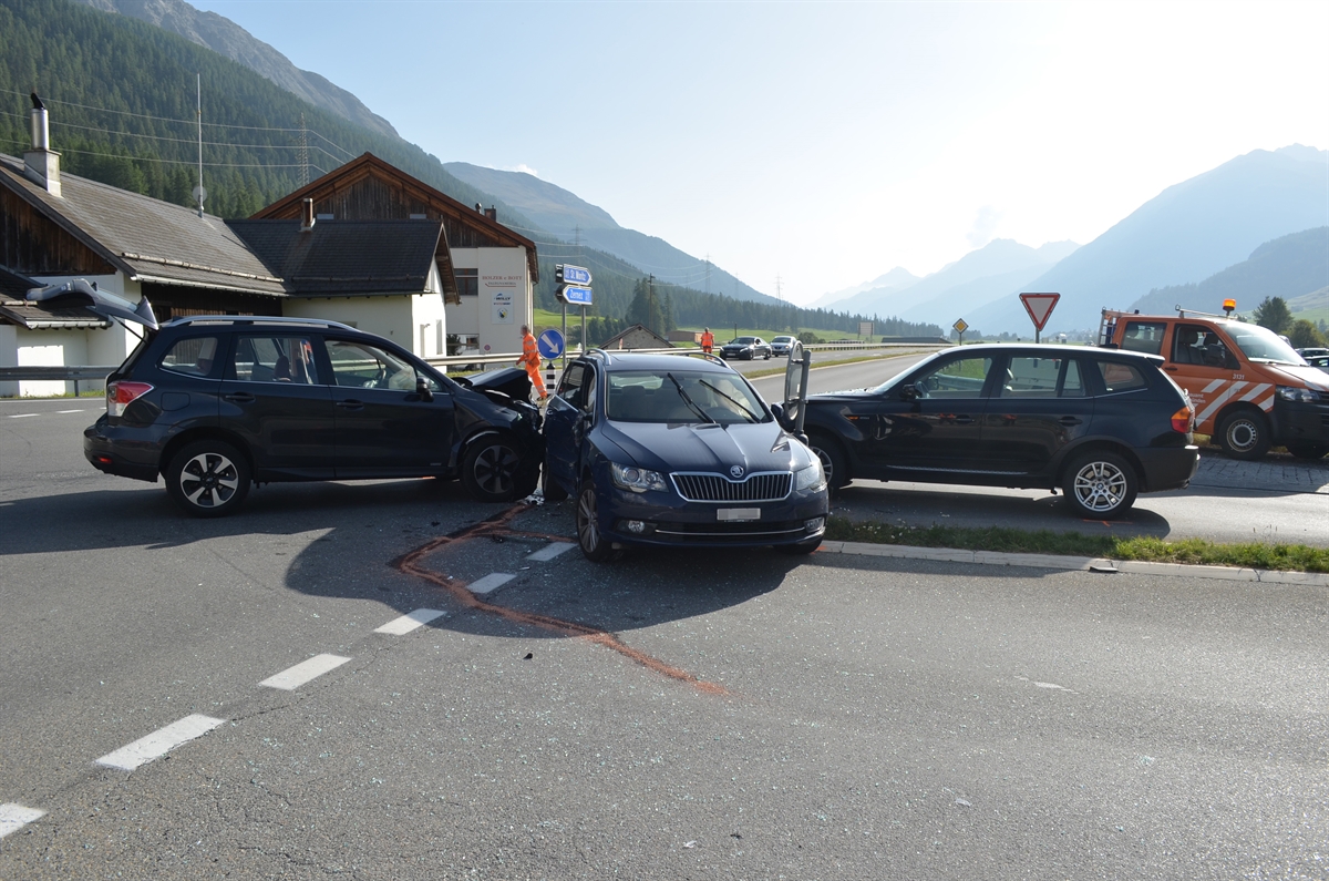 Ein 55-Jähriger bog um 16.30 Uhr auf der Hauptstrasse H27 von Madulain kommend bei der Kreuzung Resgia nach Zuoz ab. Dabei kollidierte ein auf der Gegenfahrspur nahender Personenwagen eines 56-Jährigen mit dem abbiegenden Fahrzeug. Das abbiegende Fahrzeug kollidierte dabei mit einem an der Kreuzung wartenden Auto eines 69-Jährigen. Der 56-Jährige und seine 53-jährige Beifahrerin wurden mittelschwer und der 55-Jährige leicht verletzt. Zwei Teams der Rettung Oberengadin versorgten die Verletzten vor Ort und transportierten sie ins Spital nach Samedan. Am an der Kreuzung wartenden Auto entstand erheblicher Sachschaden. Die anderen beiden Autos wurden total beschädigt.