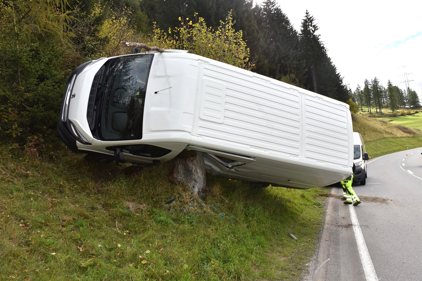 Um 9.40 Uhr überholte ein Lieferwagen auf der Fahrt von Tiefencastel in Richtung Julierpass bei der Örtlichkeit Ziegelhetta in Cunter ein Sattelmotorfahrzeug. Der Lenker eines entgegenkommenden Personenwagens konnte rechtzeitig ins Wiesland ausweichen. Der Lenker des nachfolgenden Lieferwagens wich ebenfalls aus. Er fuhr die Böschung hinauf und kippte mit seinem Fahrzeug auf einen Baumstrunk. Der erheblich beschädigte Lieferwagen wurde abgeschleppt.