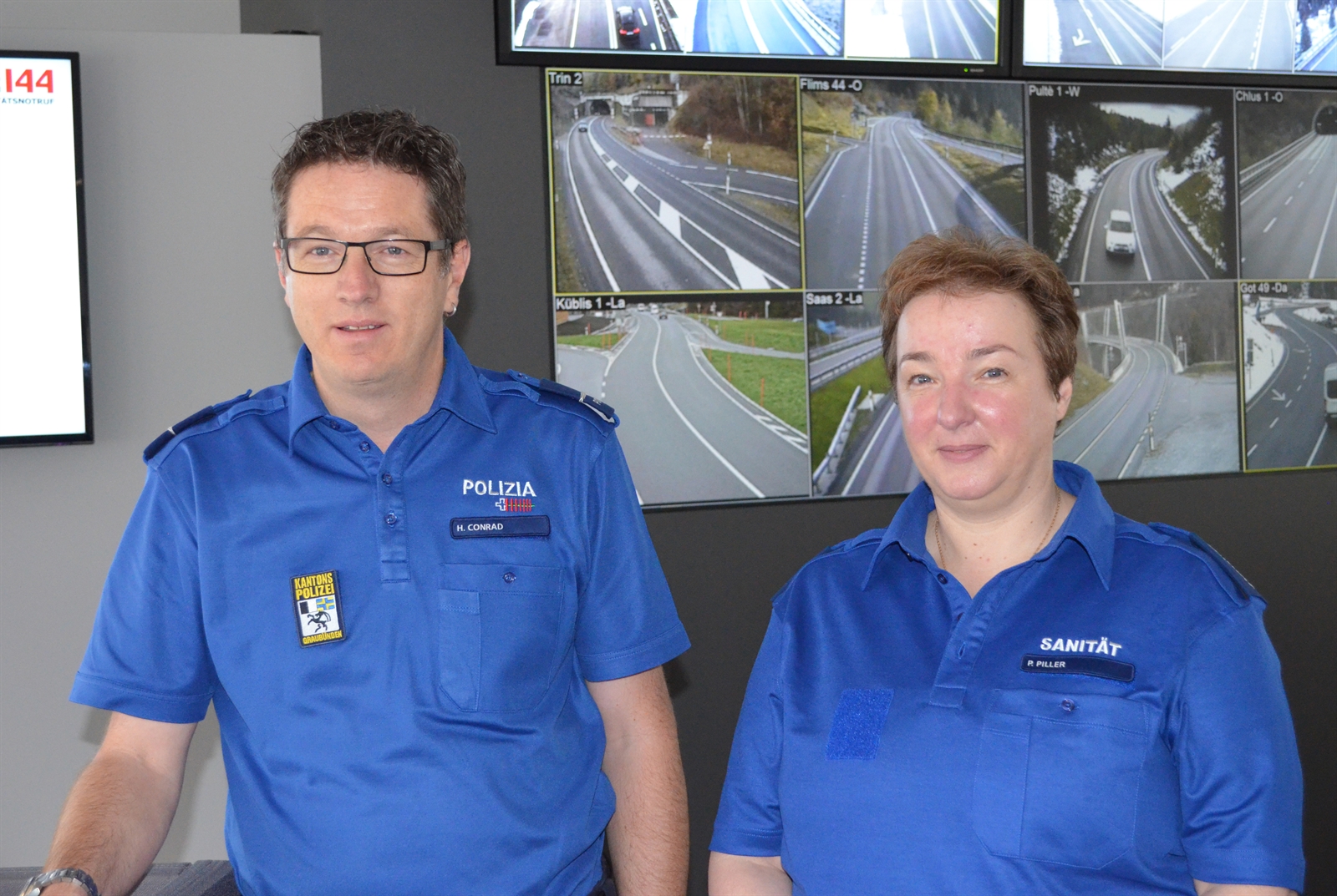 Hansjürg Conrad, Chef ELZ Kantonspolizei Graubünden, und Paula Piller, Leiterin SNZ 144 GR, freuen sich über den geglückten Start in derselben Einsatzleitzentrale.