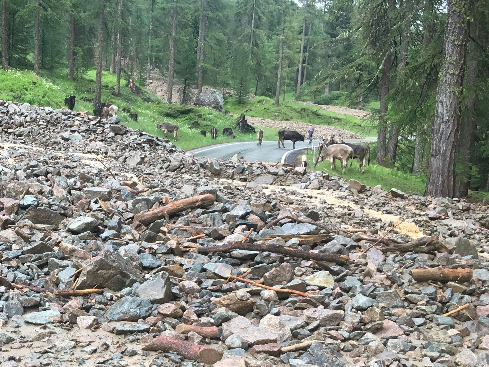 Am Mittwoch kurz nach 17 Uhr ging bei der Einsatzleitzentrale der Kantonspolizei Graubünden die Meldung über einen Murgang im Bereiche Montebello ein. Die aufgebotenen Kräfte stellten fest, dass während eines heftigen Gewitters in zeitlich kurzer Folge fünf Murgänge auf einem Abschnitt von zirka 500 Metern auf die Berninastrasse niedergegangen waren. Innerhalb dieser Abschnitte befanden sich drei Personenwagen. Auf der Zubringerstrasse Plauns waren weitere fünf Fahrzeuge und ein ausschliesslich mit dem Chauffeur besetzter Car blockiert. Ein Teil eines Murgangs breitete sich bis in den Zufahrtsbereich des dortigen Campingplatzes aus. Durch die Murgänge wurde die Einzäunung von Vieh beschädigt, welches sich anschliessend im Gebiet bewegte und durch einige Bauern umplatziert werden konnte.