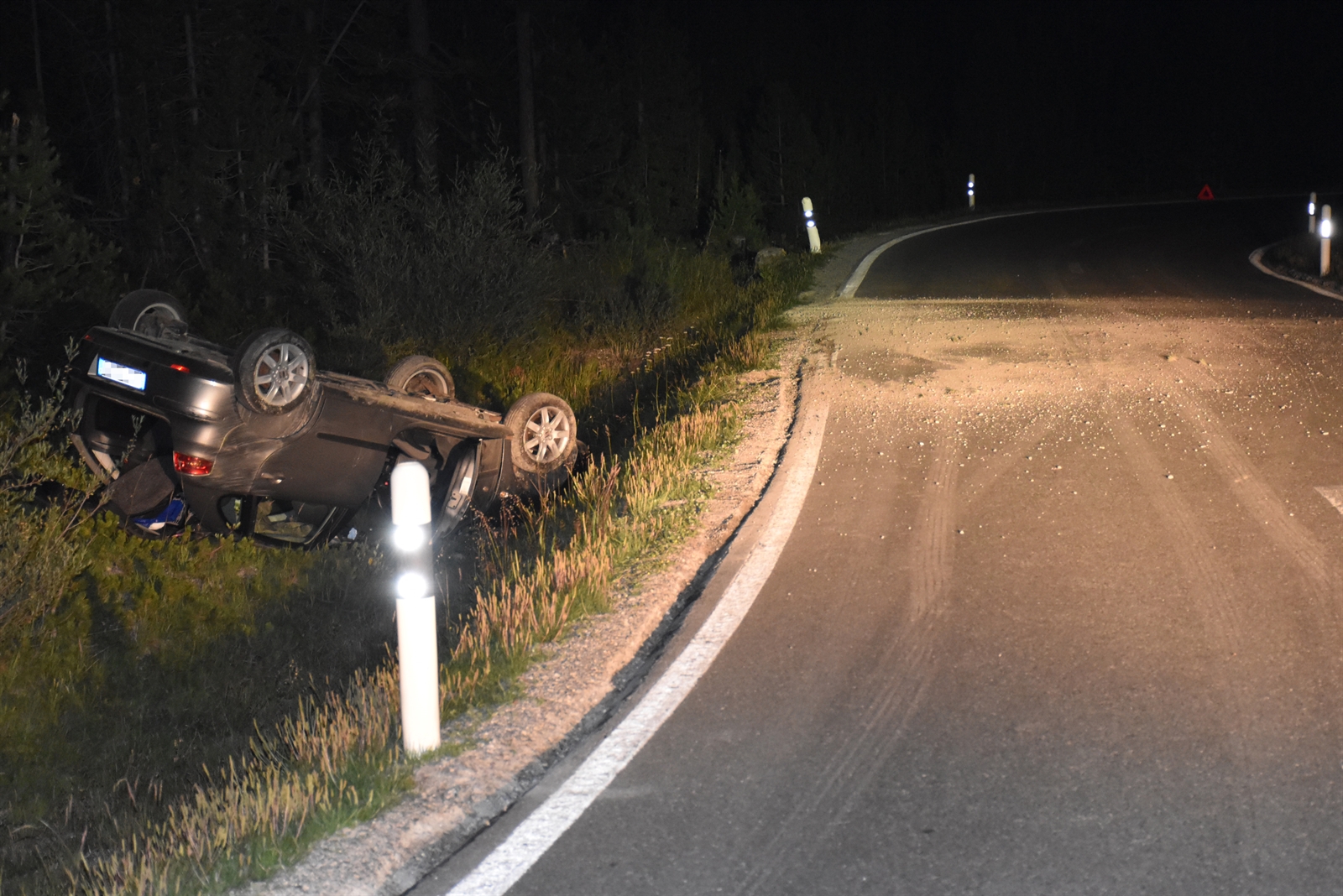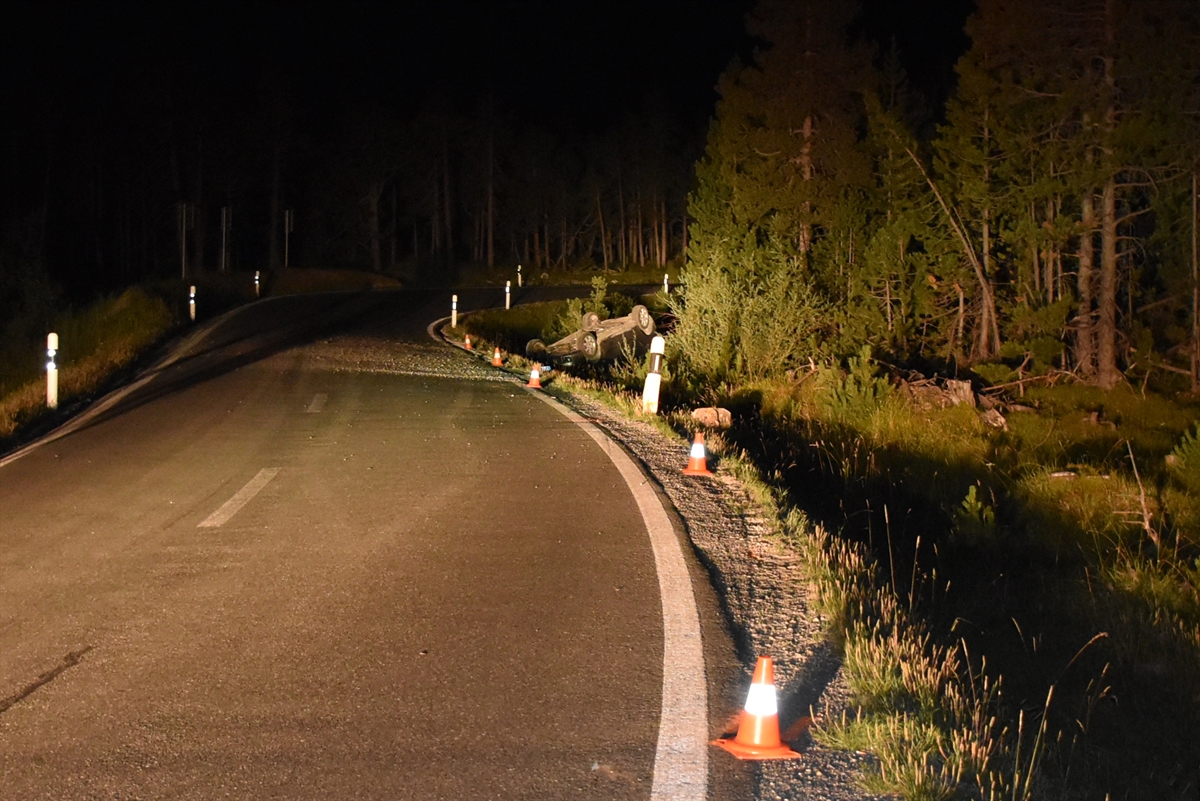 Der 28-jährige italienische Automobilist fuhr am Donnerstag kurz nach 23.30 Uhr auf der Ofenbergstrasse H28 von Tschierv in Richtung Hospiz. In einer Linkskurve geriet das Auto rechts über die Strasse hinaus. In der angrenzenden Böschung überschlug es sich auf das Dach und kam total beschädigt zum Stillstand. Der unverletzte Autolenker konnte sein Fahrzeug selbständig verlassen. Gemäss seiner Aussage musste er einem Reh ausweichen. Die bei ihm durchgeführte beweissichere Atemalkoholprobe fiel positiv aus.