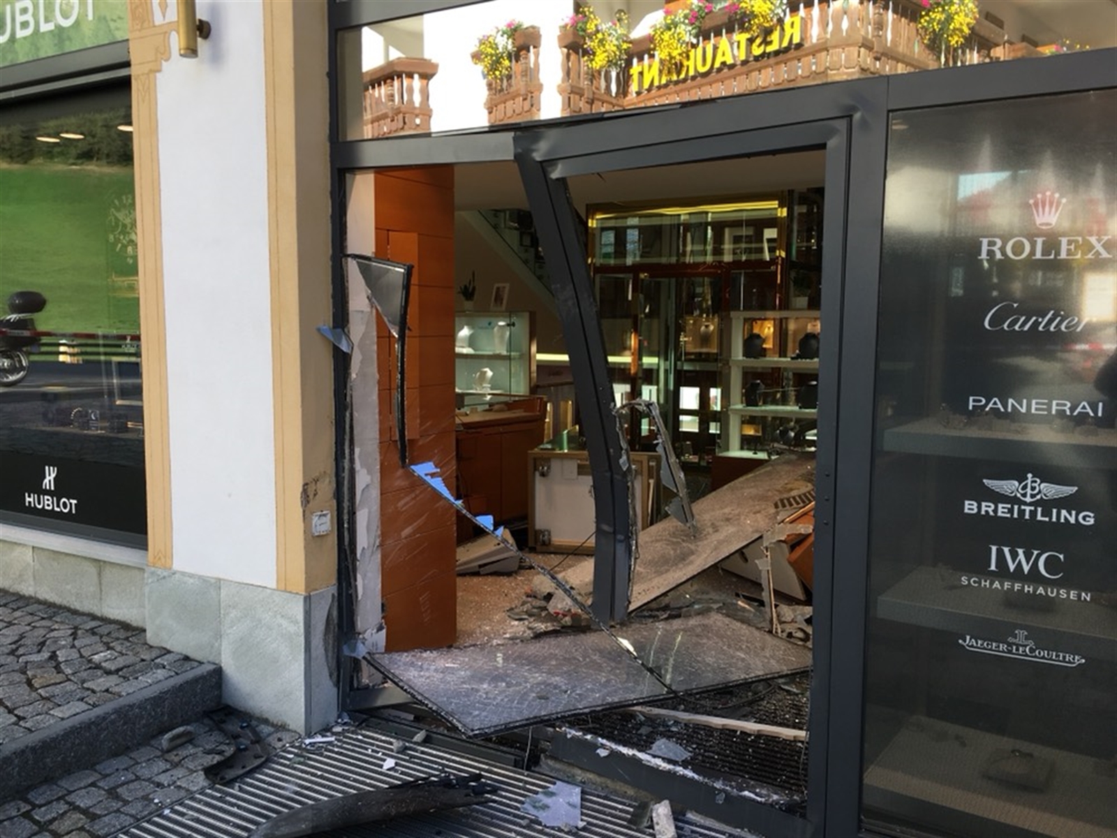 Kurz nach 4 Uhr morgens ging bei der Kantonspolizei Graubünden der Alarm über einen Einbruch in eine Bijouterie in Samnaun Dorf ein. Die Täterschaft hatte mit einem Geländefahrzeug die Eingangstür des Geschäfts eingerammt. Nach ersten Erkenntnissen wurde dieses praktisch leergeräumt. Anwohner konnten beobachten wie drei vermummte Personen ins Geschäft eindrangen. Anschliessend wurde die Flucht mit einem grauen Mercedes-Benz ergriffen. Das Fahrzeug konnte rund eine Stunde nach dem Einbruch in der Region Mals im italienischen Südtirol beobachtet werden.