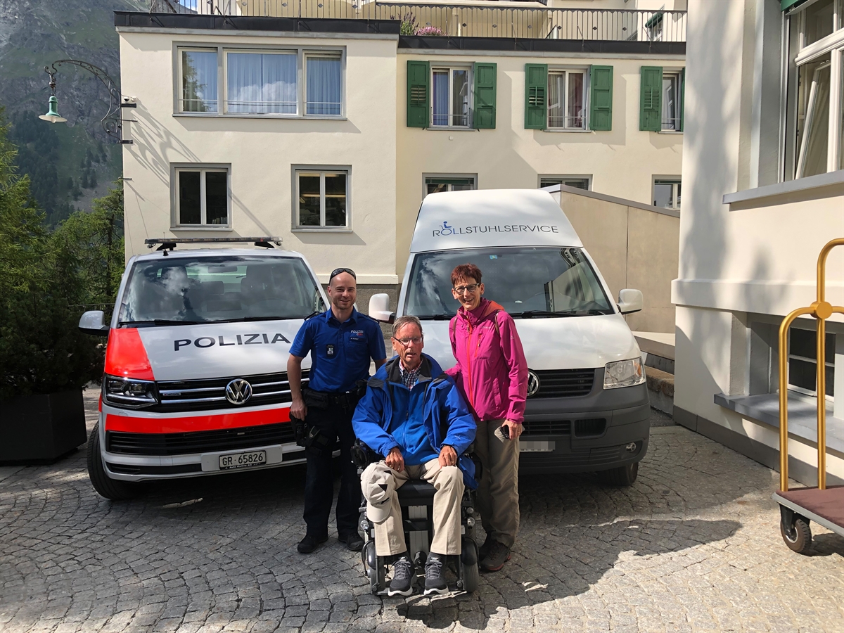 Der 68-jährige Rollstuhlfahrer war kurz vor 14.30 Uhr im Beisein seiner Frau auf dem Radweg beim Flugplatz Samedan unterwegs. Als sein Elektrorollstuhl einen Defekt erlitt, versuchten die beiden ein Taxiunternehmen aufzubieten. Das Fahrgerät wog zusammen mit dem Rollstuhlfahrer rund 200 Kilogramm. Weil über längere Zeit keine Chauffeure in der Region unterwegs waren, wurde die Kantonspolizei Graubünden aufgeboten. Diese kontaktierte den Rollstuhlservice Oberengadin und bekam die Erlaubnis ein Auto auszuleihen. Daraufhin wurde der Rollstuhlfahrer zusammen mit seiner Frau durch eine Polizeipatrouille mit dem ausgeliehenen Rollstuhltransporter ins Hotel nach Sils i.E. transportiert.