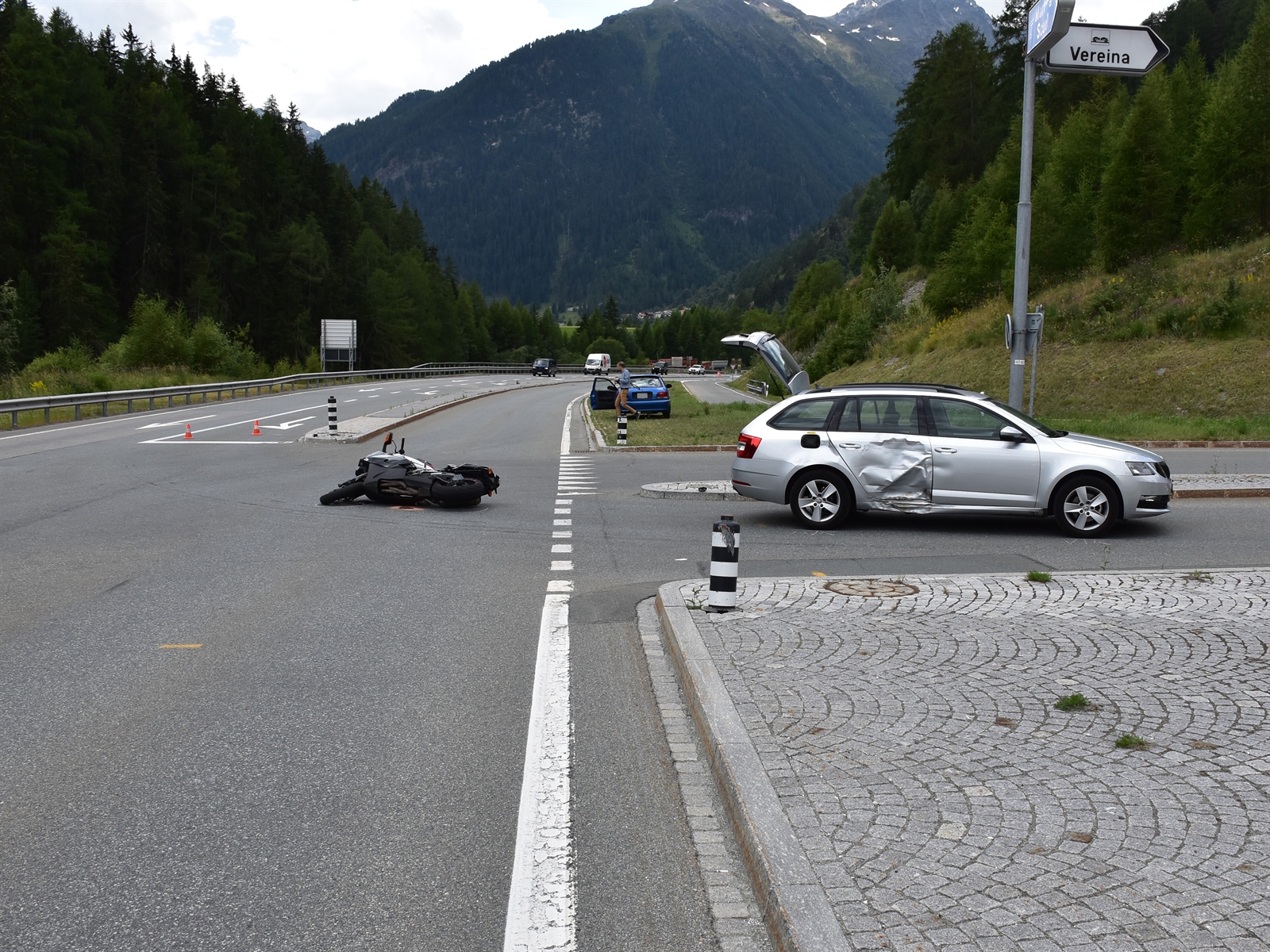Ein 67-jähriger Automobilist bog am Freitag kurz nach 12.30 Uhr von der Hauptstrasse H27 links zum Verladebahnhof Sagliains ab. Dabei übersah er einen entgegenkommenden 66-jährigen Motorradlenker auf der Engadinerstrasse und es kam zu einer seitlich-frontalen Kollision. Bei dieser zog sich der Motorradfahrer mittelschwere Verletzungen zu. Ein Dienstarzt der Region Zernez versorgte den Zweiradlenker notfallmedizinisch, bevor dieser durch ein Ambulanzteam des Stützpunktes Zernez ins Spital nach Scuol überführt wurde. An beiden Fahrzeugen entstand erheblicher Sachschaden. Die genaue Unfallursache wird durch die Kantonspolizei Graubünden untersucht.