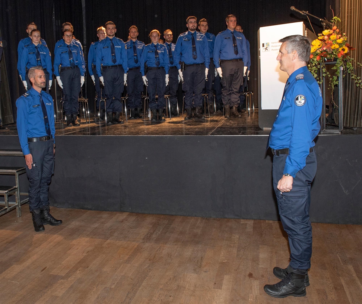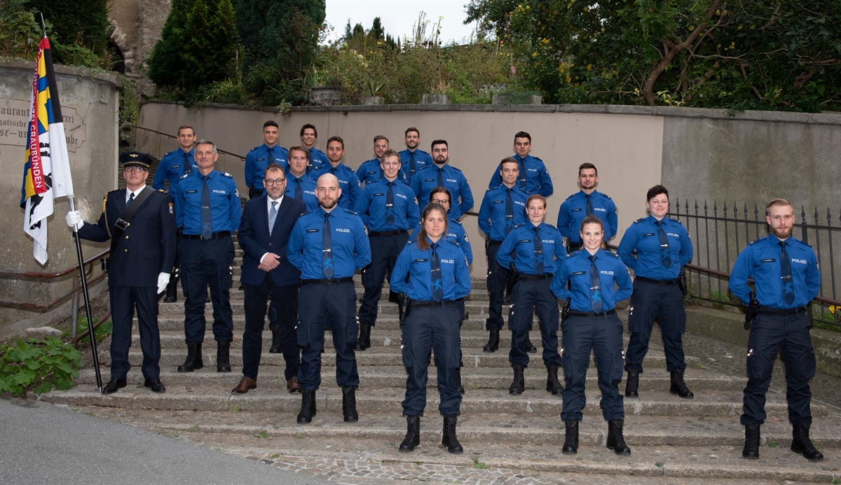Per Handschlag über der Korpsfahne gaben die 19 neuen Korpsmitglieder dem Kommandanten, Oberst Walter Schlegel, ihr Amtsgelübde ab. "Damit übernehmen Sie ab dem heutigen Tag eine wichtige Staatsaufgabe im Bereich der Sicherheit", sagte Schlegel und betonte: "Als Angehörige der Kantonspolizei Graubünden repräsentieren Sie das staatliche Gewaltmonopol. Damit sind hohe Verantwortung und Sozialkompetenz verbunden. Als Polizistinnen und Polizisten bewegen Sie sich in allen Schichten der Gesellschaft und in allen Lebenslagen. Sie sehen die Sorgen und Ängste der Menschen und Sie müssen zu Hilfe eilen, wenn Gefahr droht oder Not herrscht und sich Menschen nicht mehr selber helfen können. Dann müssen Sie bereit sein, Ihr Wissen und Können einzusetzen, Ihren Mut und Ihre Erfahrung zu gebrauchen, Ihre Hingabe an die Menschen und die Aufgabe zu beweisen." Regierungsrat Peter Peyer gratulierte den Brevetierten in seiner Ansprache zur bestandenen eidgenössischen Berufsprüfung. "Sie stehen für die prägenden Werte der Polizeiarbeit wie die Menschenwürde, Unparteilichkeit, Teamfähigkeit, Selbstreflexion. Leben Sie diese Werte in Ihrem zukünftigen beruflichen Alltag."