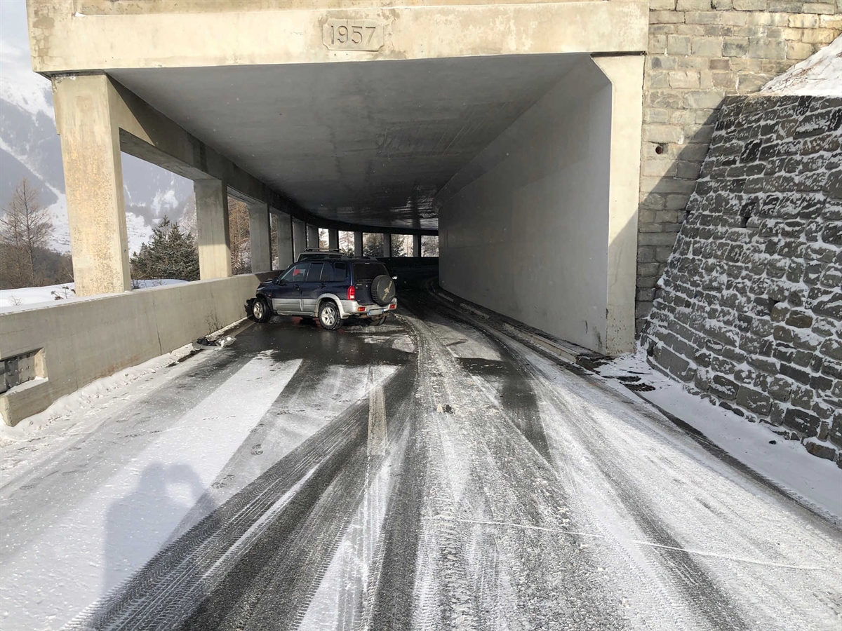 Ein 47-jähriger italienischer Fahrzeuglenker fuhr um 08:06 Uhr auf der Ofenpassstrasse vom Val Mustair kommend in Richtung Zernez. Bei der Örtlichkeit Val dal Barcli kam sein Fahrzeug auf der mit Schnee bedeckten Fahrbahn innerhalb einer Rechtskurve ins Schleudern und kollidierte heftig mit dem Portal einer Lawinengalerie. Nach dem Aufprall wurde das Fahrzeug auf die Gegenfahrbahn geschleudert und kam an der gegenüberliegenden Galeriewand zum Stillstand. Das Fahrzeug wurde dadurch total beschädigt. Eine Mitfahrerin wurde dabei verletzt und musste mit der Ambulanz Zernez ins Spital Scuol überführt werden. Die drei weiteren Insassen des Fahrzeugs, der Lenker und zwei Kinder, kamen mit dem Schrecken davon.