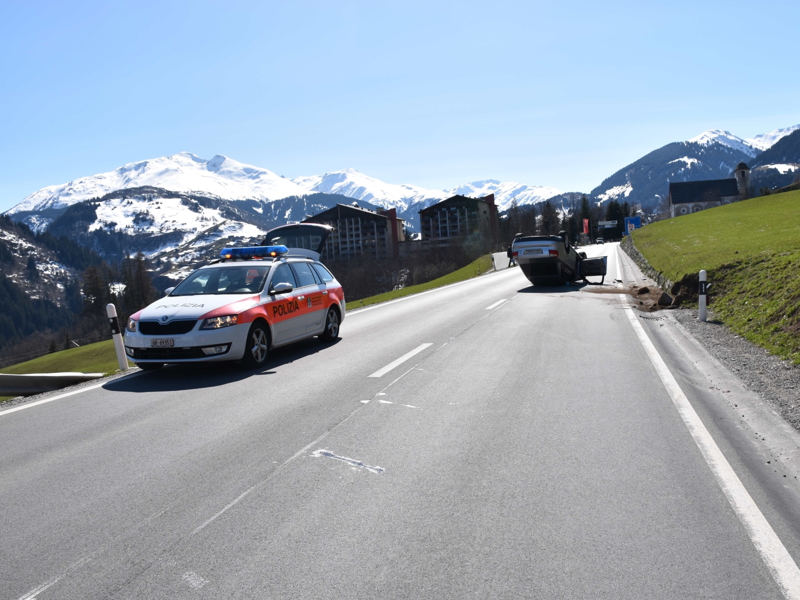 Am Donnerstagnachmittag ist auf der Hauptstrasse in Disentis/Mustér ein Auto mit einer Böschungsmauer kollidiert. Es kippte auf das Dach und kam auf der Fahrbahn zum Stillstand.