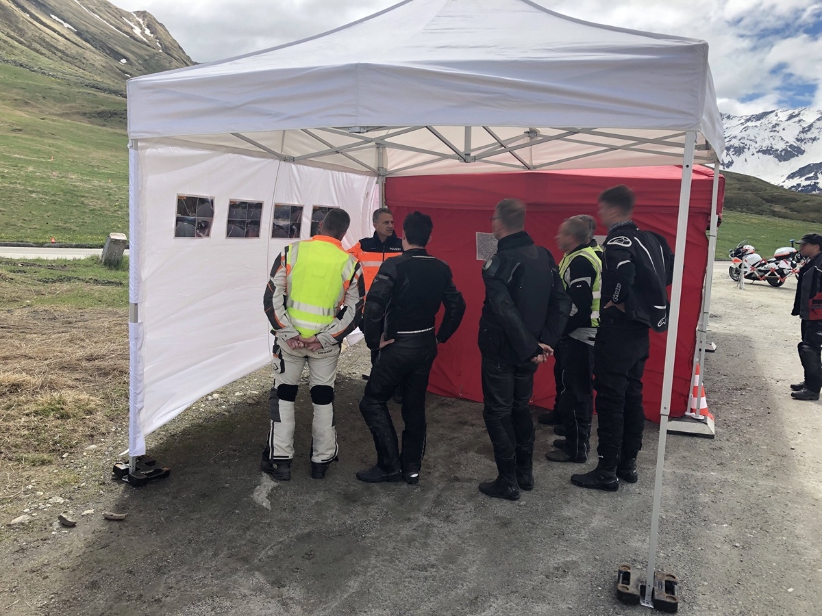 L'ina va patgific cun la moto sin il pass e giauda – ultra dal traject attractiv – er curt la vista sin las muntognas. L'autra tira curvas in pau pli sportivas en direcziun da l'ospizi. Ed andetgamain: signals faudads a l'ur dal vial cun l'inscripziun "POLIZIA". In polizist fa segn a la ciclista da bandunar la via. Ella vegn retschavida amicablamain cun ils pleds "Allegra, Polizia chantunala, nus faschain in'acziun da prevenziun per motociclistas e motociclists".