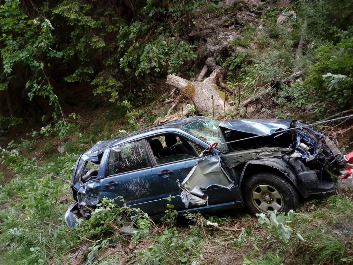 Total beschädigtes Fahrzeug im Tobel zwischen den Bäumen