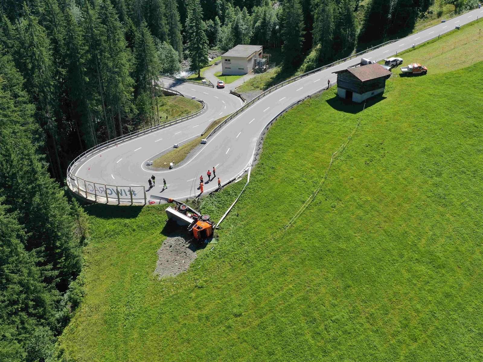 Der 35-jährige Chauffeur fuhr am Mittwoch kurz vor 11 Uhr von Arosa kommend unterhalb Litzirüti talwärts. In einer Rechtswendekehre kollidierte sein Lastwagen mit der linksseitigen Leitplanke, durchbrach diese und kippte im angrenzenden Wiesland auf die rechte Fahrzeugseite. Die in Bewegung versetzten Leitplankenelemente beschädigten drei bergwärts fahrende Autos. Der Chauffeur wurde für eine medizinische Überprüfung zu einem Arzt nach Arosa transportiert. Am Lastwagen entstand Totalschaden und an den drei Autos ein Schaden von total über zehntausend Franken. Die Kantonspolizei Graubünden stellte den Lastwagen im Auftrag der Staatsanwaltschaft sicher und ermittelt gemeinsam mit dieser den genauen Unfallhergang.