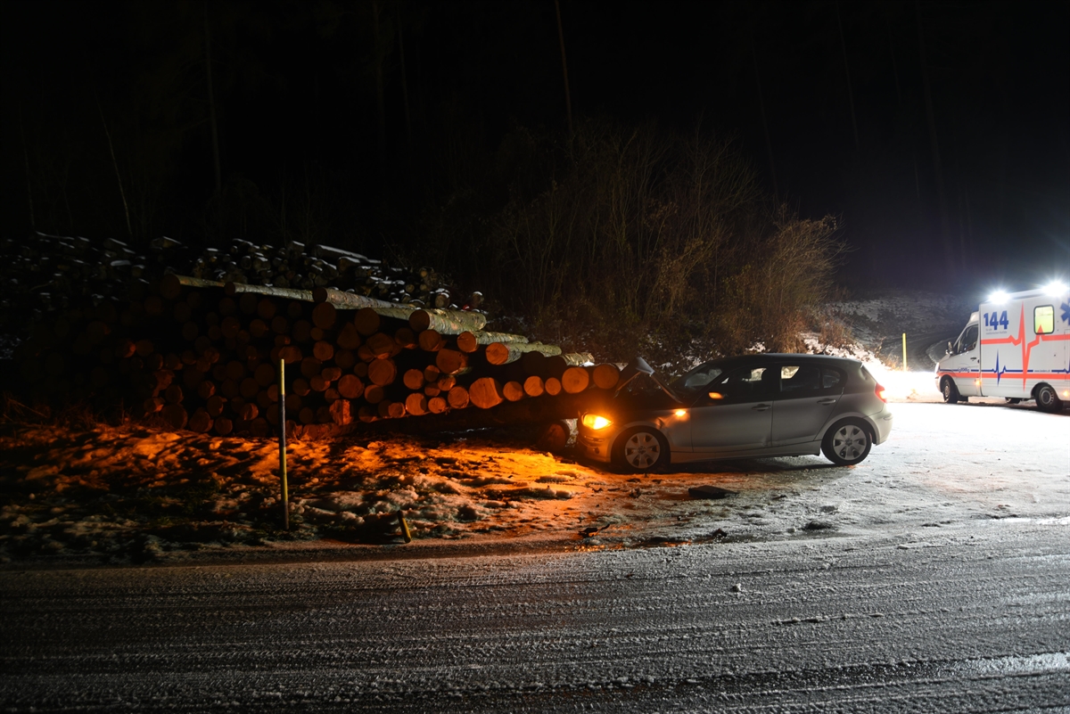 Eine 22-jährige Personenwagenlenkerin fuhr zusammen mit drei Kollegen um 4 Uhr morgens auf der Italienischen Strasse von Rhäzüns in Richtung Rothenbrunnen. In einer Linkskurve rutschte das Fahrzeug auf der vereisten Strasse geradeaus über einen Holzlagerplatz und prallte in die dort gelagerten Baumstämme. Die vier Insassen wurden verletzt und mit je einer Ambulanz der Rettung Chur sowie der Rettung Mittelbünden ins Kantonsspital Graubünden und ins Spital nach Thusis überführt. Das total beschädigte Fahrzeug wurde abgeschleppt.