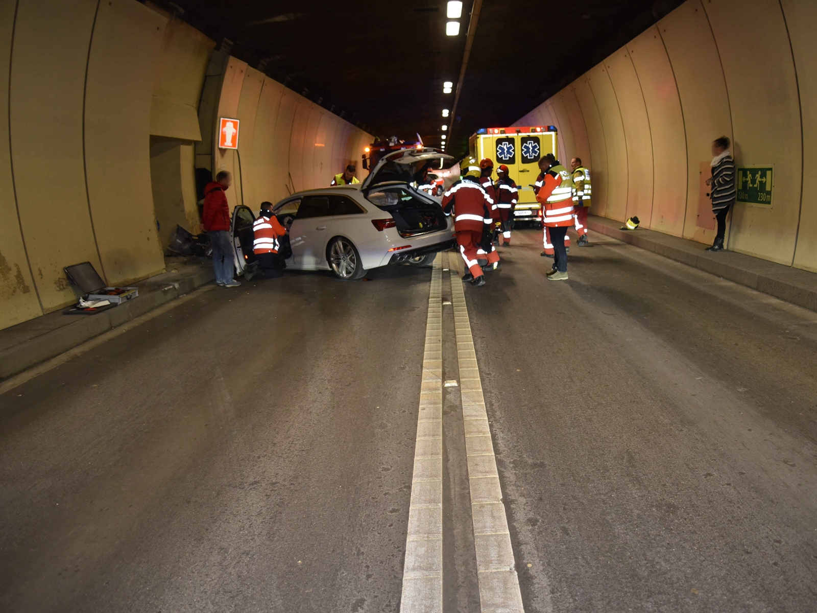 Im San Bernardinotunnel ist am Samstagmittag ein Auto mit Bordsteinen und einer Tunnelwand kollidiert. Der Fahrer und seine Mitfahrerin zogen sich dabei Verletzungen zu.