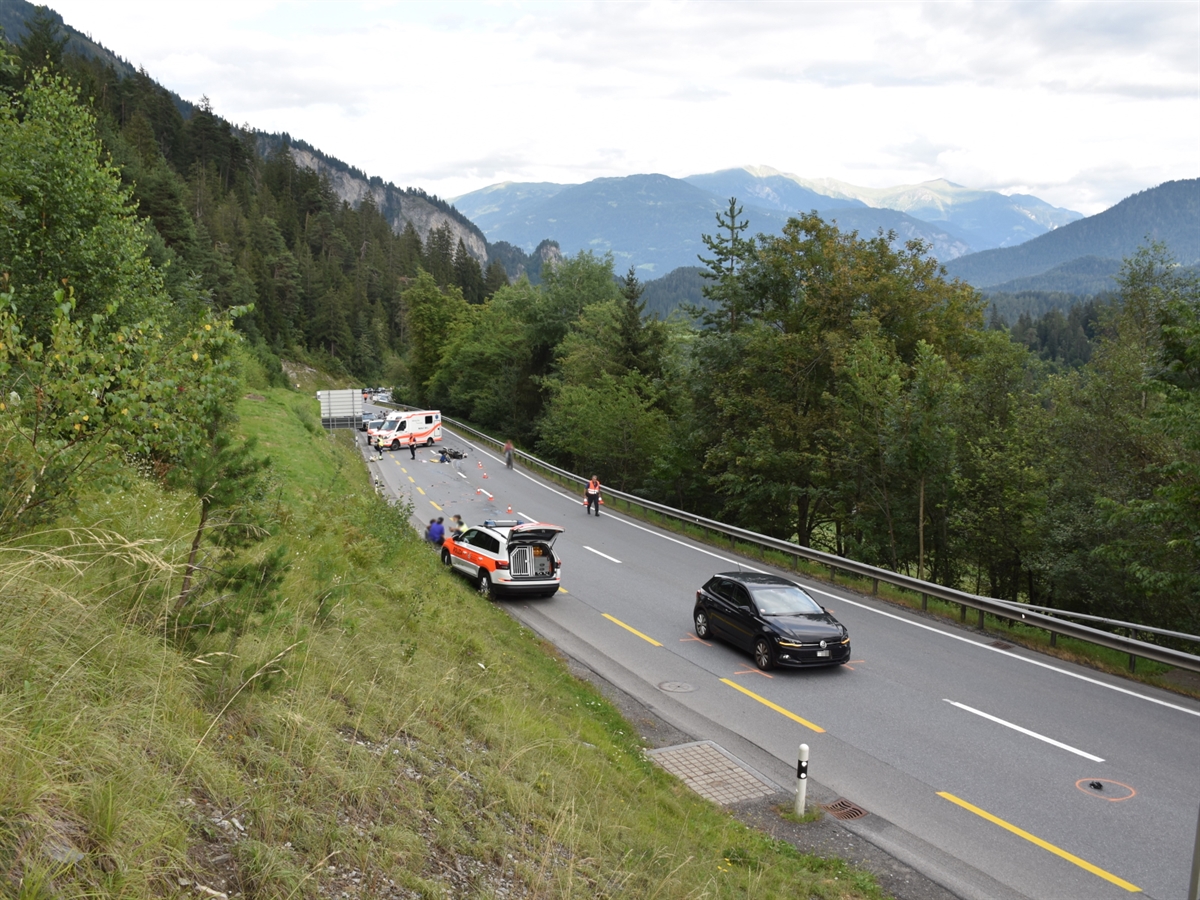Eine vierköpfige Motorradgruppe aus Spanien fuhr am Dienstag von Ilanz kommend über die Hauptstrasse H19 in Richtung Tamins. Kurz vor 17.30 Uhr kam es nach dem Flimsersteintunnel in einer Rechtskurve zu einer Kollision zwischen dem an vierter Stelle fahrenden 31-Jährigen und einem in Richtung Flims fahrenden 19-jährigen Automobilisten. Dabei wurde der Motorradfahrer schwer verletzt. Er musste nach der notfallmedizinischen Betreuung durch Drittpersonen sowie einer Ambulanz der Rettung Chur mit einem Rettungshelikopter der Alpine Air Ambulance ins Kantonsspital Graubünden geflogen werden. Die beiden leicht verletzten Autoinsassen brachte das Ambulanzteam zur Kontrolle ins Kantonsspital Graubünden nach Chur. Die Unfallursache sowie der genaue Unfallhergang wird zusammen mit der Staatsanwaltschaft durch die Kantonspolizei Graubünden abgeklärt.