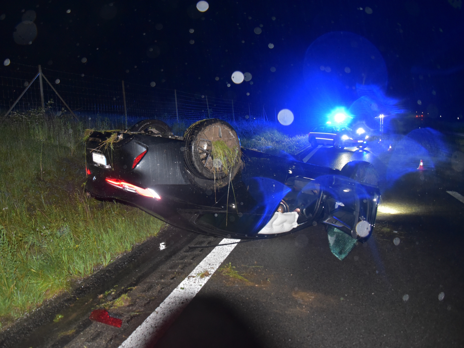 Ein 29-jähriger Automobilist fuhr gegen 22 Uhr in Begleitung einer 23-Jährigen von San Bernardino kommend über die A13 in Richtung Bellinzona. Höhe Cama verlor der Fahrzeugführer gemäss eigenen Angaben aufgrund des starken Regens die Herrschaft über das Auto, welches rechts von der Strasse abkam. Nach dem Befahren eines ansteigenden Erdwalls überschlug es das Auto zurück auf die Fahrbahn und kam auf dem Dach liegend zum Stillstand. Die beiden Fahrzeuginsassen konnten das Auto unverletzt selbständig verlassen. Die Kantonspolizei Graubünden klärt die Umstände zu diesem Verkehrsunfall ab.