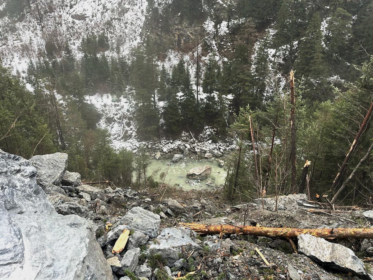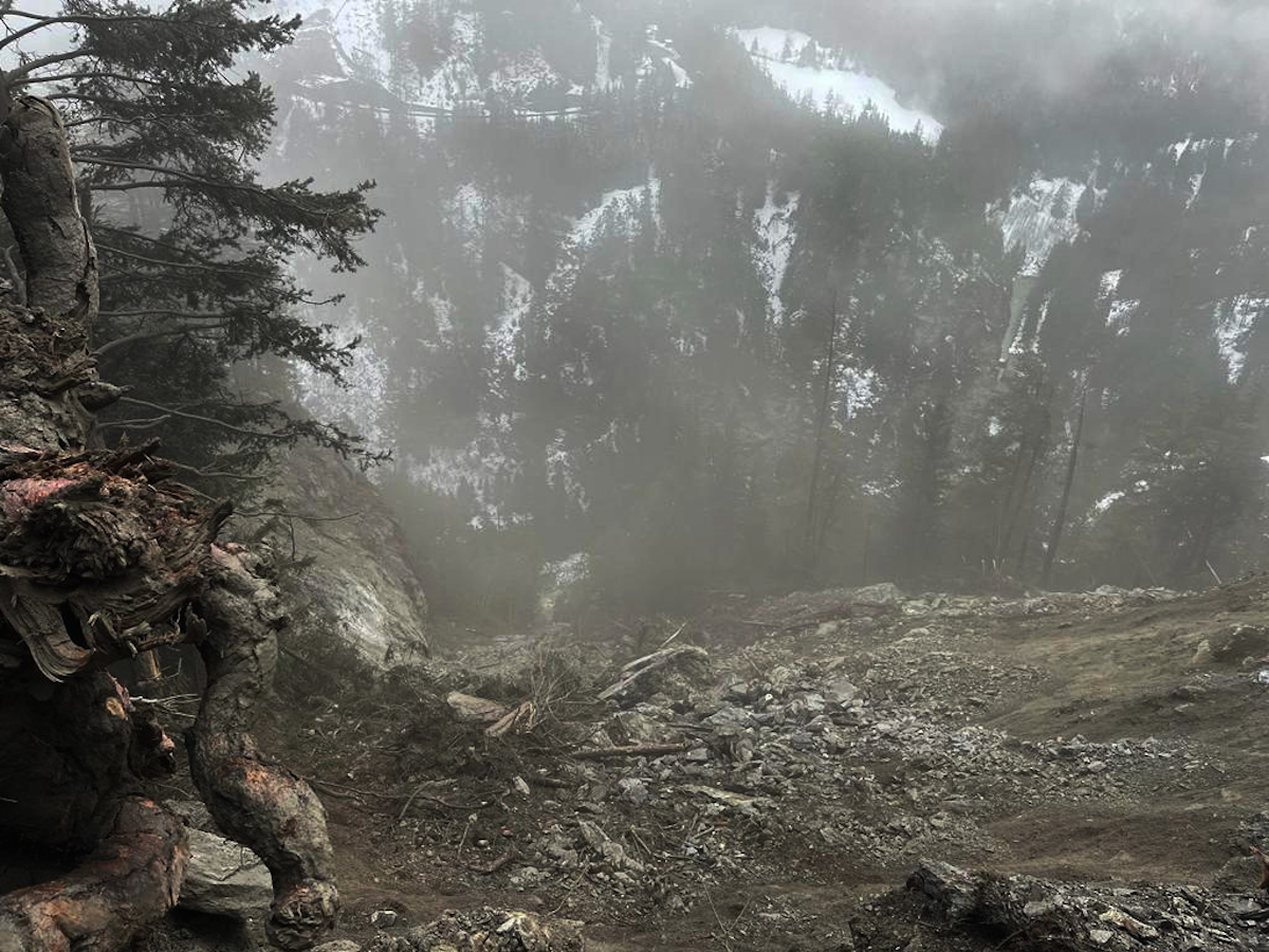 Sturzbahn zwischen der Samnauner- und der Engadinerstrasse gefüllt mit Gesteinsmaterial