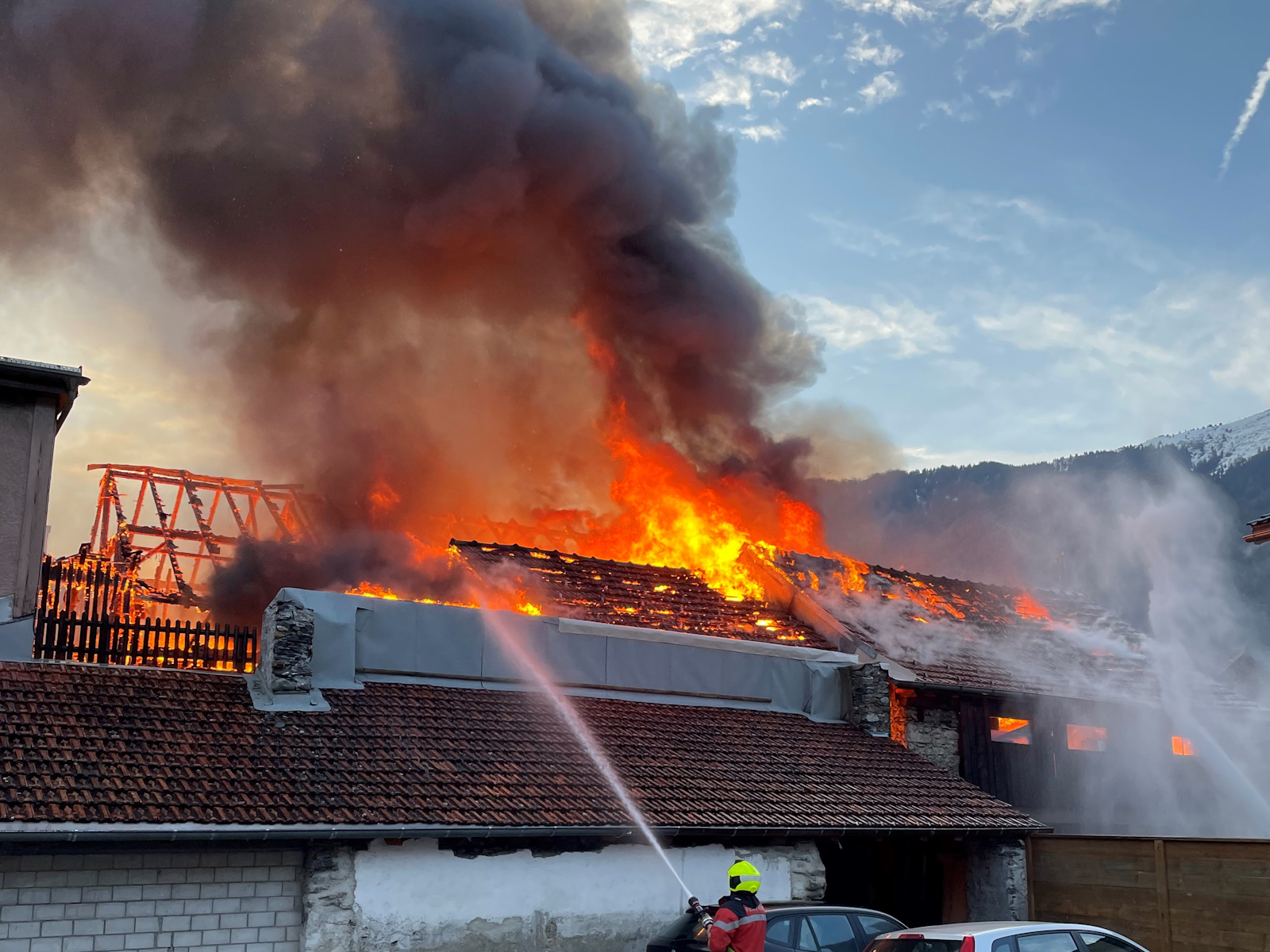 Am Montagmorgen ist in Domat/Ems in einem Stallgebäude ein Brand ausgebrochen. Das Feuer breitete sich auf weitere Gebäude aus.
