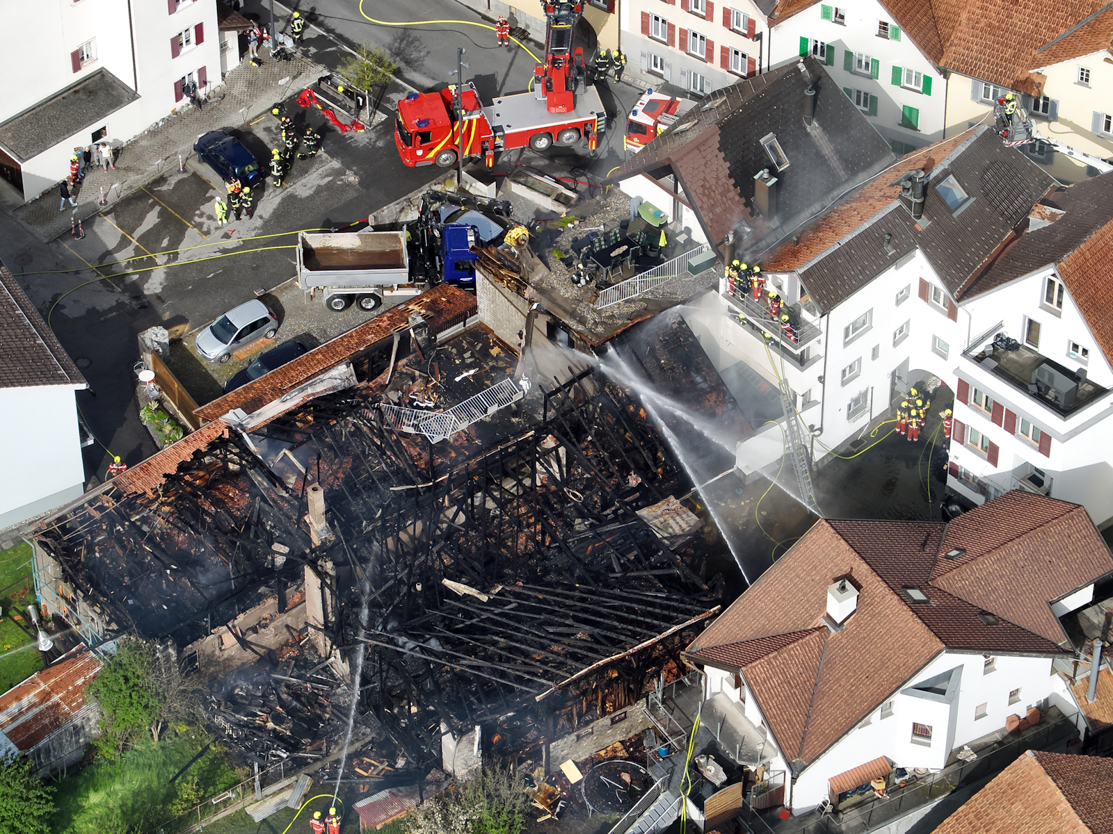 Kurz vor 7 Uhr ging die Meldung bei der Einsatzleitzentrale der Kantonspolizei Graubünden ein, wonach in Domat/Ems mitten im Dorf in einem Stall ein Feuer ausgebrochen sei. Trotz des raschen Eingreifens von rund 120 Leuten der Feuerwehr Domat/Ems-Felsberg, der Werkfeuerwehr Ems-Chemie sowie der Feuerwehr der Stadt Chur konnte das Übergreifen der Flammen auf einen weiteren Stall sowie zwei Wohnhäuser nicht verhindert werden. Nach rund drei Stunden waren die Brände mehrheitlich unter Kontrolle. Zwei Ställe sind vollständig abgebrannt und bei einem der zwei Wohnhäuser entstand grosser Sachschaden. Glücklicherweise konnten drei Personen mit Verdacht auf Rauchgasvergiftung nach dem Untersuch unverletzt entlassen werden.