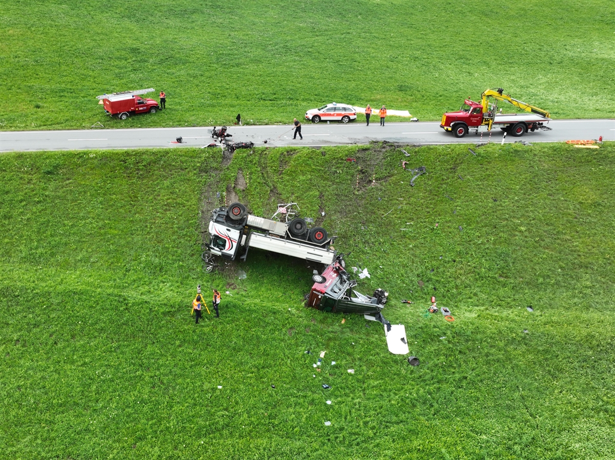 Gemäss ersten Erkenntnissen fuhr kurz nach 15 Uhr ein 49-jähriger Chauffeur mit seinem Lastwagen von Ilanz kommend talaufwärts in Richtung Trun. Gleichzeitig fuhren ein Wohnmotorwagen sowie zwei Motorräder talauswärts in Richtung Ilanz. In einer Linkskurve im Gebiet Gula in Rueun kam der schwere Motorwagen auf der nassen Fahrbahn ins Schleudern und drehte sich um die eigene Achse. Dabei kollidierte er mit dem entgegenkommenden Wohnmotorwagen sowie dem ersten Motorrad einer 56-Jährigen. Durch die Kollision riss der Lastwagen den Wohnmotorwagen von der Strasse und beide stürzten überschlagend einen Abhang hinunter. Die Lenkerin des Wohnmotorwagens wurde im Fahrzeug eingeklemmt. Drittpersonen leisteten sofort Erste Hilfe bis zwei Teams der Rettung Surselva sowie zwei Helikopter der Rega eintrafen. Trotz der notfallmedizinischen Betreuung verstarb die Frau auf der Unfallstelle. Ihre 14-jährige Tochter, welche ebenfalls im Wohnmotorwagen mitfuhr, wurde mittelschwer verletzt. Auch die gestürzte Motorradfahrerin erlitt schwere Verletzungen. Beide wurden mit je einem Helikopter ins Kantonsspital Graubünden nach Chur überflogen. Der zweite Motorradfahrer konnte noch eine Vollbremsung einleiten, das Motorrad ablegen und so eine Kollision verhindern. Er und sein Sozius sowie der Lastwagenchauffeur blieben unverletzt.