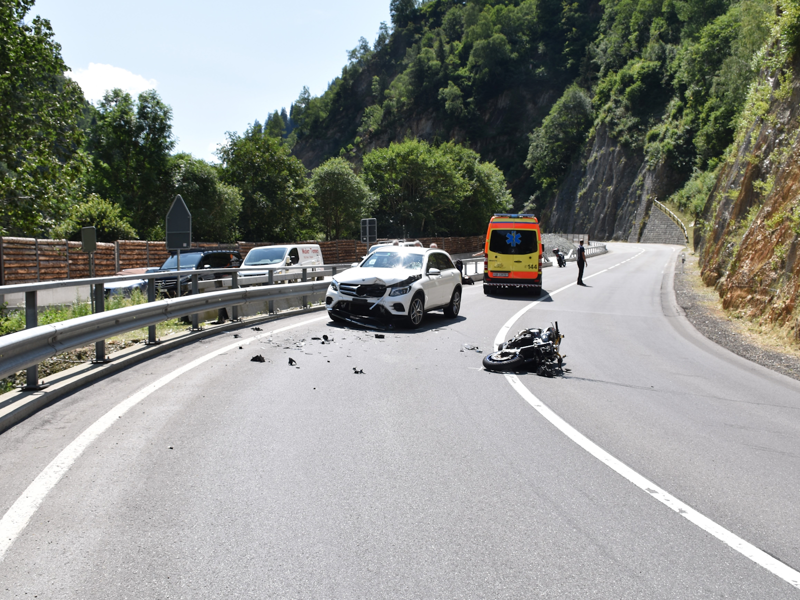 Am frühen Donnerstagnachmittag ist auf der Lukmanierstrasse in Disentis/Mustér ein Motorrad in einer Kurve mit einem Auto kollidiert. Dabei wurde der Motorradfahrer verletzt.